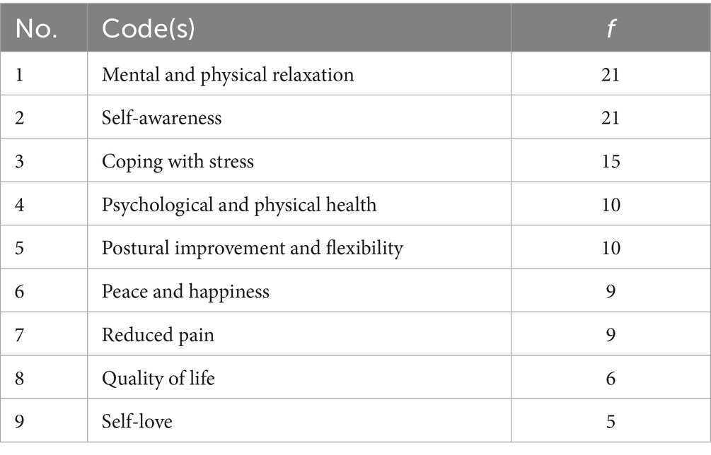 The codes “mental and physical relaxation” (f = 21) and “self-awareness” (f = 21) emerge as the most emphasized themes, indicating that participants experience a high level of need or perceived benefit in these areas. Similarly, the code “coping with stress” (f = 15) stands out as a significant theme among participants.