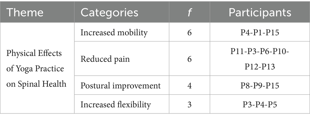 The results of the content analysis on the theme of spinal health and physical effects in individuals with spinal disorders who participated in yoga practice are presented in Table 4. Among the physical effects of yoga, the most frequently reported benefits by participants were increased mobility (f = 6) and reduced pain (f = 6). Postural improvement (f = 4) and increased flexibility (f = 3) were also highlighted as significant findings. Participant statements frequently emphasized the importance of following the instructor’s guidance and paying attention to proper posture during practice. To provide evidence supporting the findings, selected participant responses are presented below: