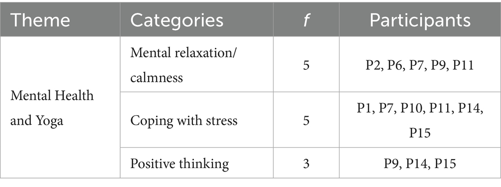 The results of the content analysis regarding the effects of yoga practice on mental health in individuals with spinal disorders are presented in Table 5. Participants strongly expressed the positive impact of yoga on mental well-being. The most frequently emphasized benefit was mental relaxation/calmness (f = 5), followed by coping with stress (f = 6). In addition, some participants stated that they developed more positive thoughts (f = 3).