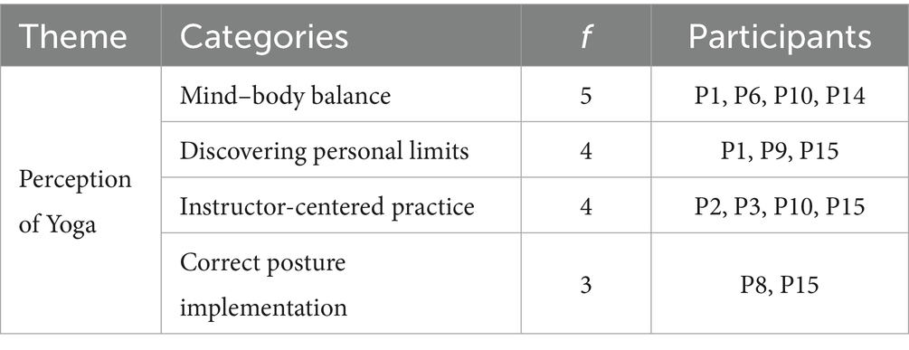 P11: “For me, yoga represents both mental and physical relaxation. It helps clear my mind and lowers my stress levels during the day. My yoga journey began during my fourth year of university with a yoga course. Before that, I used to feel lower back pain during long walks, but after starting yoga, especially my lower back pain decreased, my walking duration increased, and the discomfort subsided.”