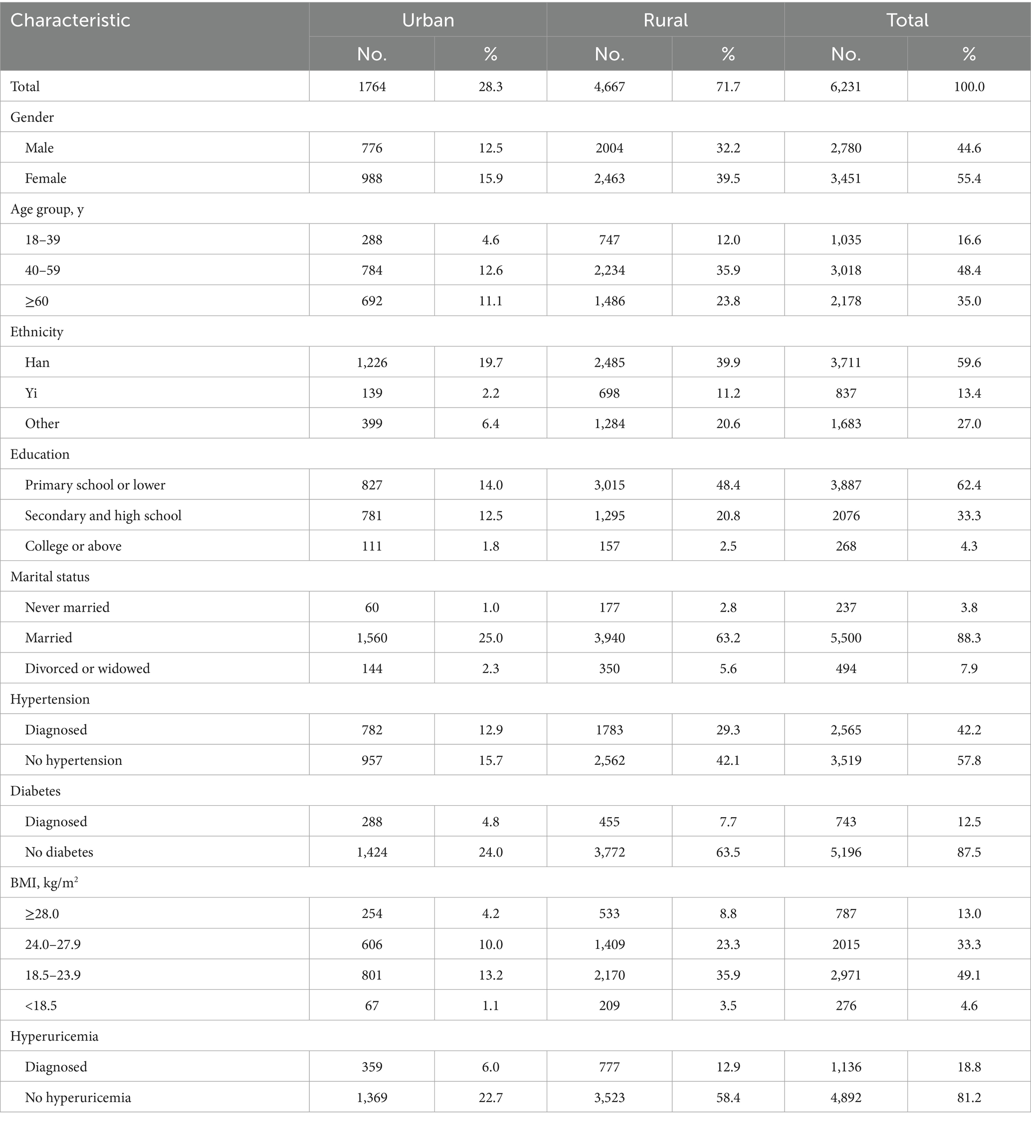 A total of 6,231 participants were included. The sample distribution was as follows: 44.6% male and 55.4% female; 28.3% urban residents and 71.7% rural residents; and 16.6% aged 18–39 years, 48.4% aged 40–59 years, and 35.0% aged ≥60 years, as shown in Table 1.