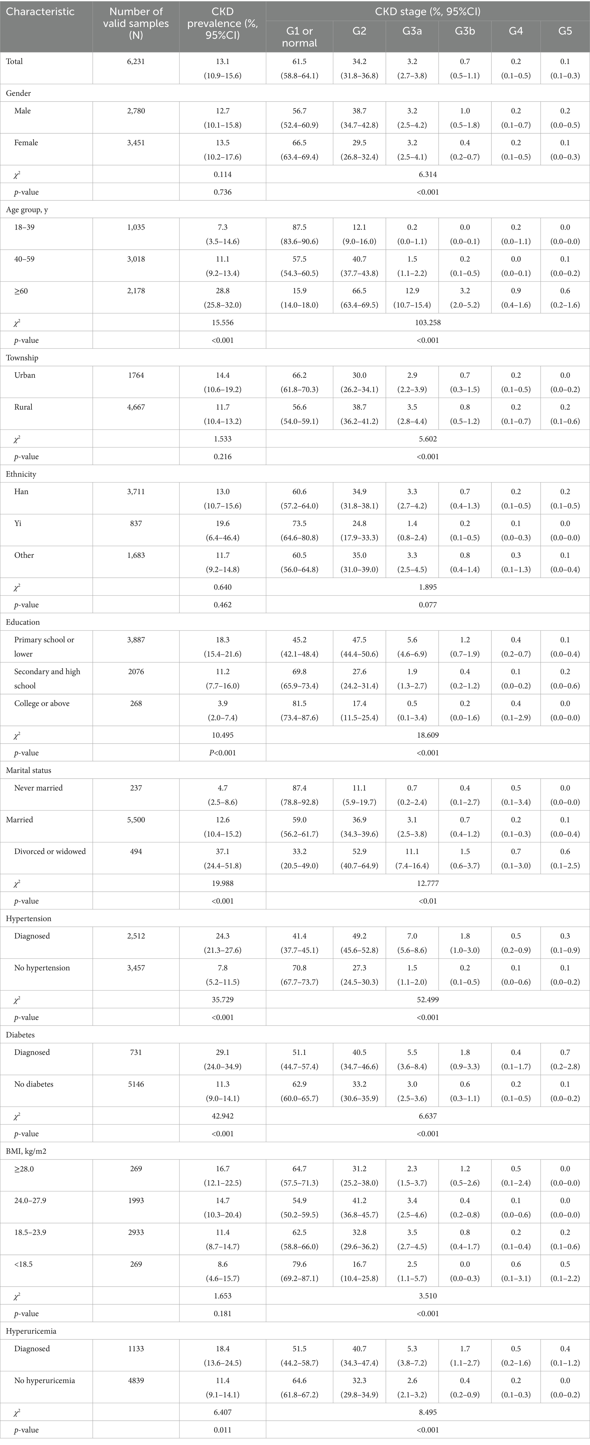 Previous studies have indicated that gender is a risk factor for CKD, with women generally exhibiting a higher prevalence than men (33). However, in our survey, no statistically significant difference was observed between males (12.7%; 95% CI: 10.1–15.8%) and females (13.5%; 95% CI: 10.2–17.6%). This finding may be attributed to the higher prevalence of hypertension and diabetes among males in Yunnan, potentially increasing their risk of developing CKD.
