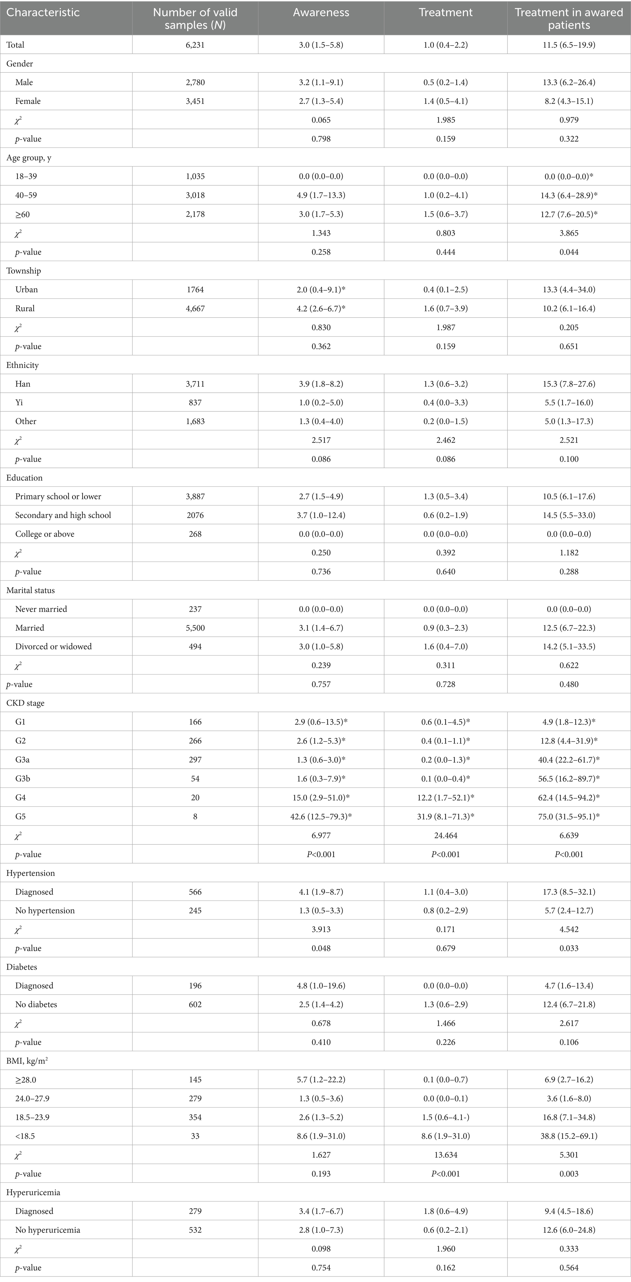 Among CKD patients aware of their diagnosis, 11.5% (95% CI: 6.5–19.9%) reported current treatment. Treatment rates varied significantly by age (χ2 = 3.865, p = 0.044), renal function stage (χ2 = 6.639, p < 0.001). Hypertensive patients showed higher rates than non-hypertensive counterparts (χ2 = 4.542, p = 0.033), with underweight patients demonstrating higher rates than normal/overweight-obese patients (χ2 = 5.301, p = 0.003) (Table 3).