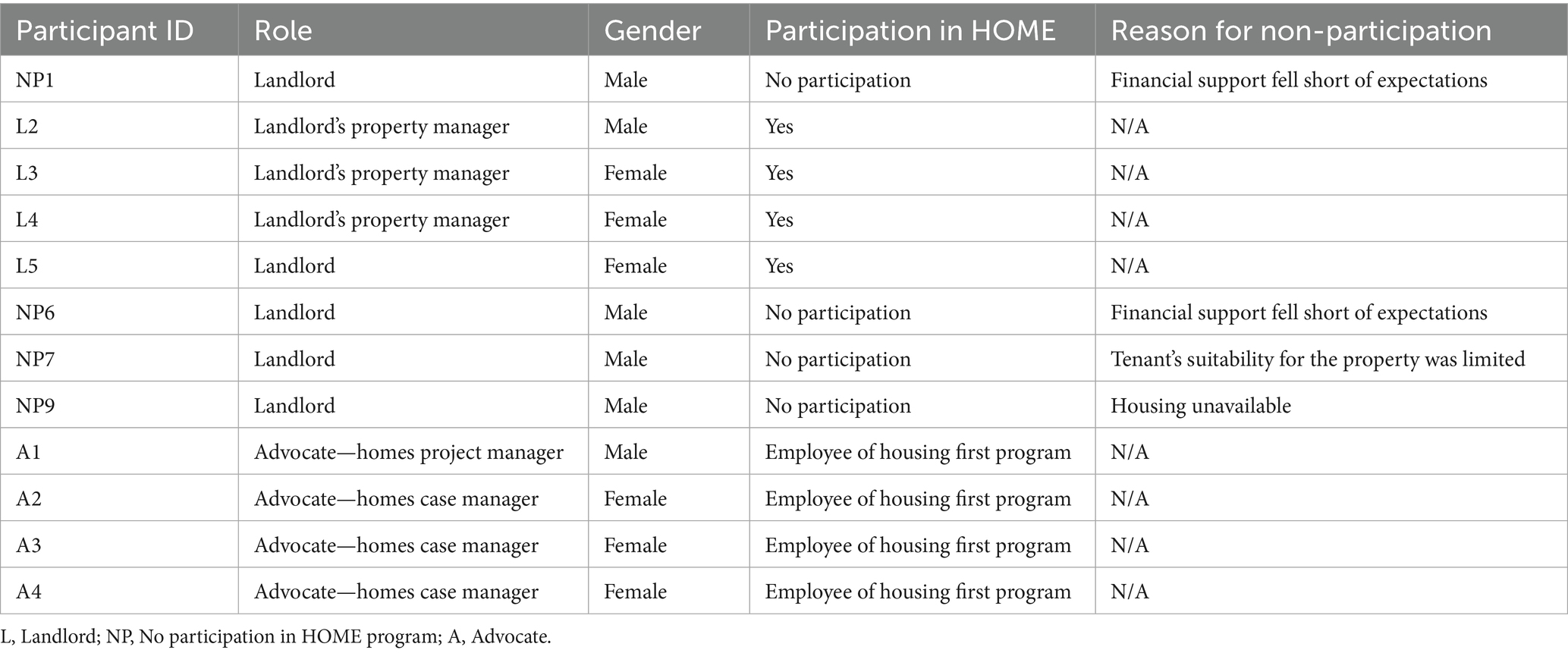 We contacted 30 landlords, including 15 who had participated in HOME and 15 who had chosen not to participate in HOME but had experience with a similar housing program for YEH including youth with LSI. A total of 11 landlords expressed interest, and eight completed the interviews, including four HOME participants and four non-participants. Including landlords who declined HOME participation helped reduce bias, identify barriers, and diversify perspectives (50). We also recruited four advocates with direct experience securing housing for YEH with LSI.