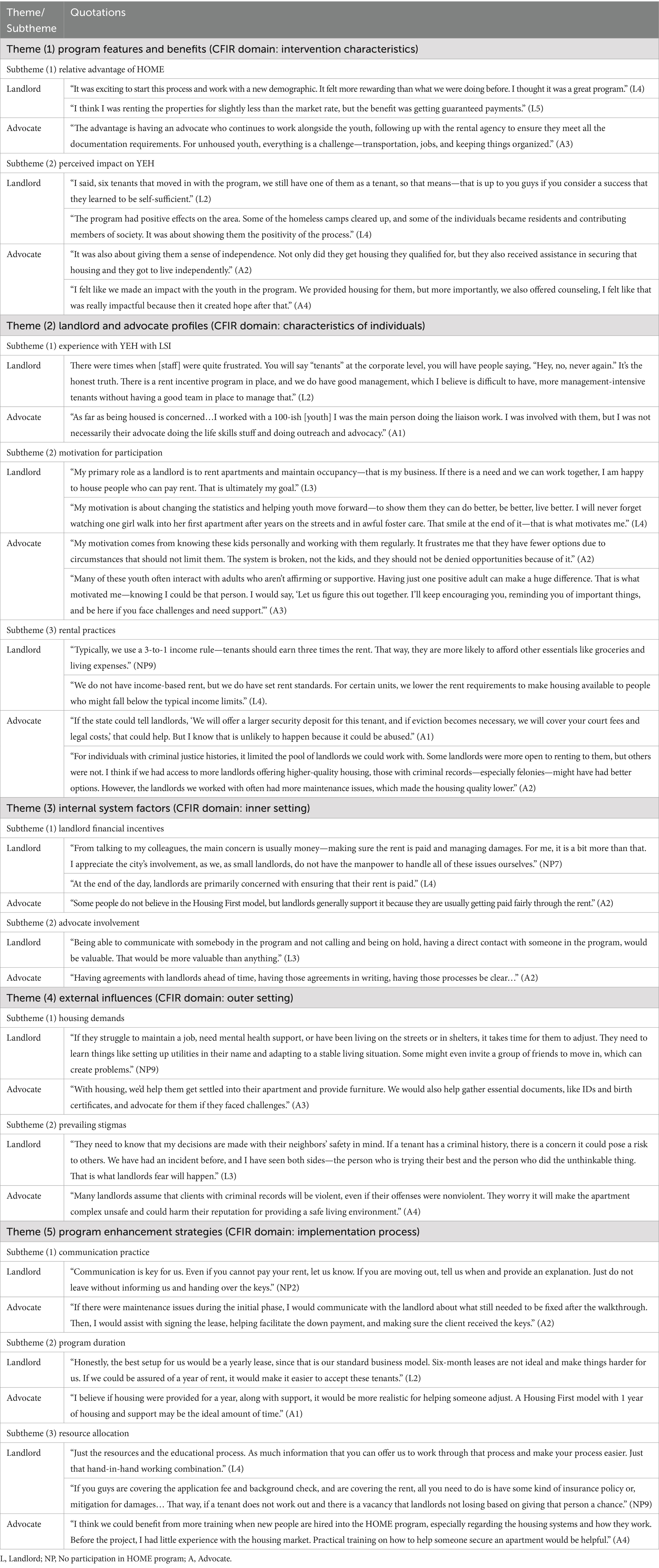 Interview guides were developed based on existing supportive housing literature (20, 28, 45, 46) and the Consolidated Framework for Implementation Research (CFIR) Interview Guide Tool (47–49). CFIR, a widely used and validated framework for identifying factors that influence implementation, informed both the design of the interview guides and the analytic approach. This framework ensured a consistent and comprehensive examination of multilevel implementation factors (47–49). Interview questions focused on landlords’ and advocates’ perspectives and experiences implementing the HOME program for YEH, particularly those with prior LSI. Questions were organized according to the five CFIR domains, addressing the constructs relevant to understanding the factors that could influence the successful implementation of the HOME program: characteristics of HOME; characteristics of landlords and advocates; inner setting; outer setting; and implementation process. Interview guides were pilot tested with experts in the field who were not subjects in the study (e.g., landlord, advocate, and health services and health disparity researchers) and refined accordingly.