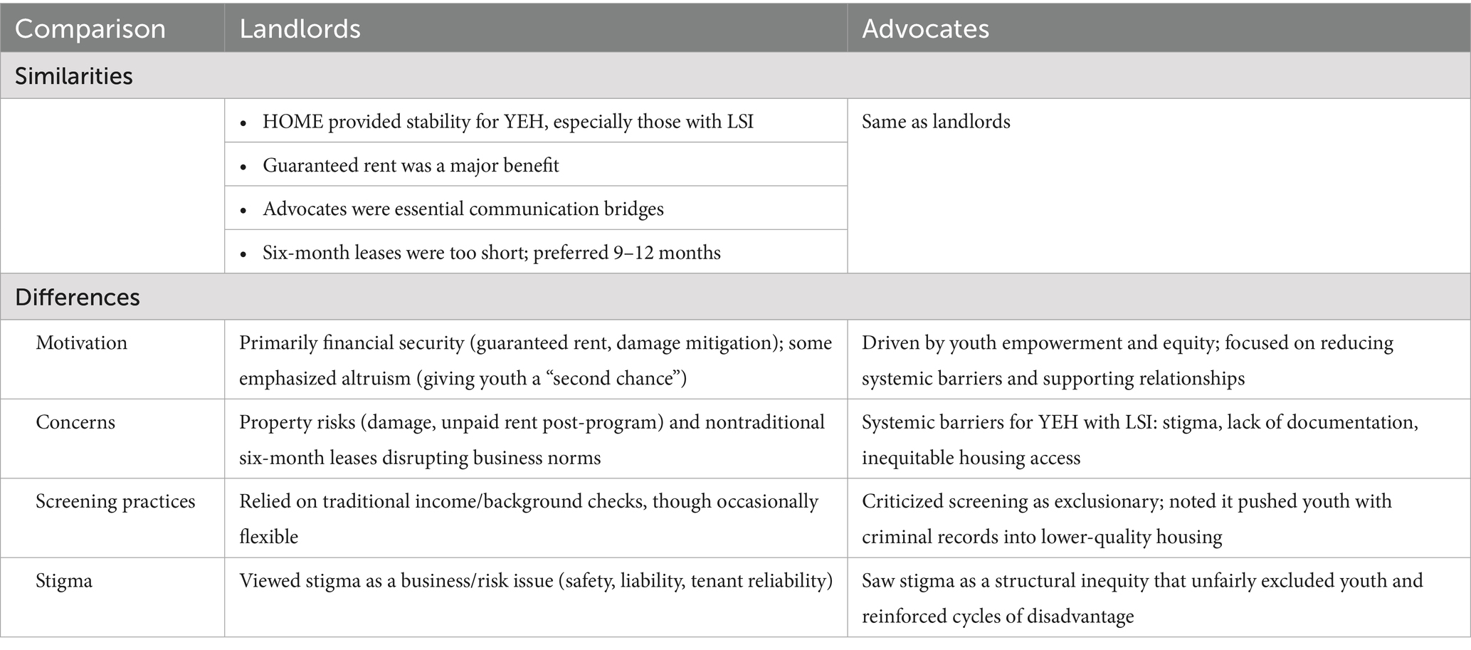 Table 3 summarizes the key similarities and differences in perspectives on HOME implementation between landlords and advocates. Landlords and advocates agreed that HOME was valuable, offering landlords financial security through guaranteed rent and providing youth with housing stability. Both also highlighted the essential role of advocates. However, their perspectives also diverged in key areas: landlords viewed HOME primarily through a risk–benefit business lens, while advocates emphasized youth equity concerns and the need for systemic change.