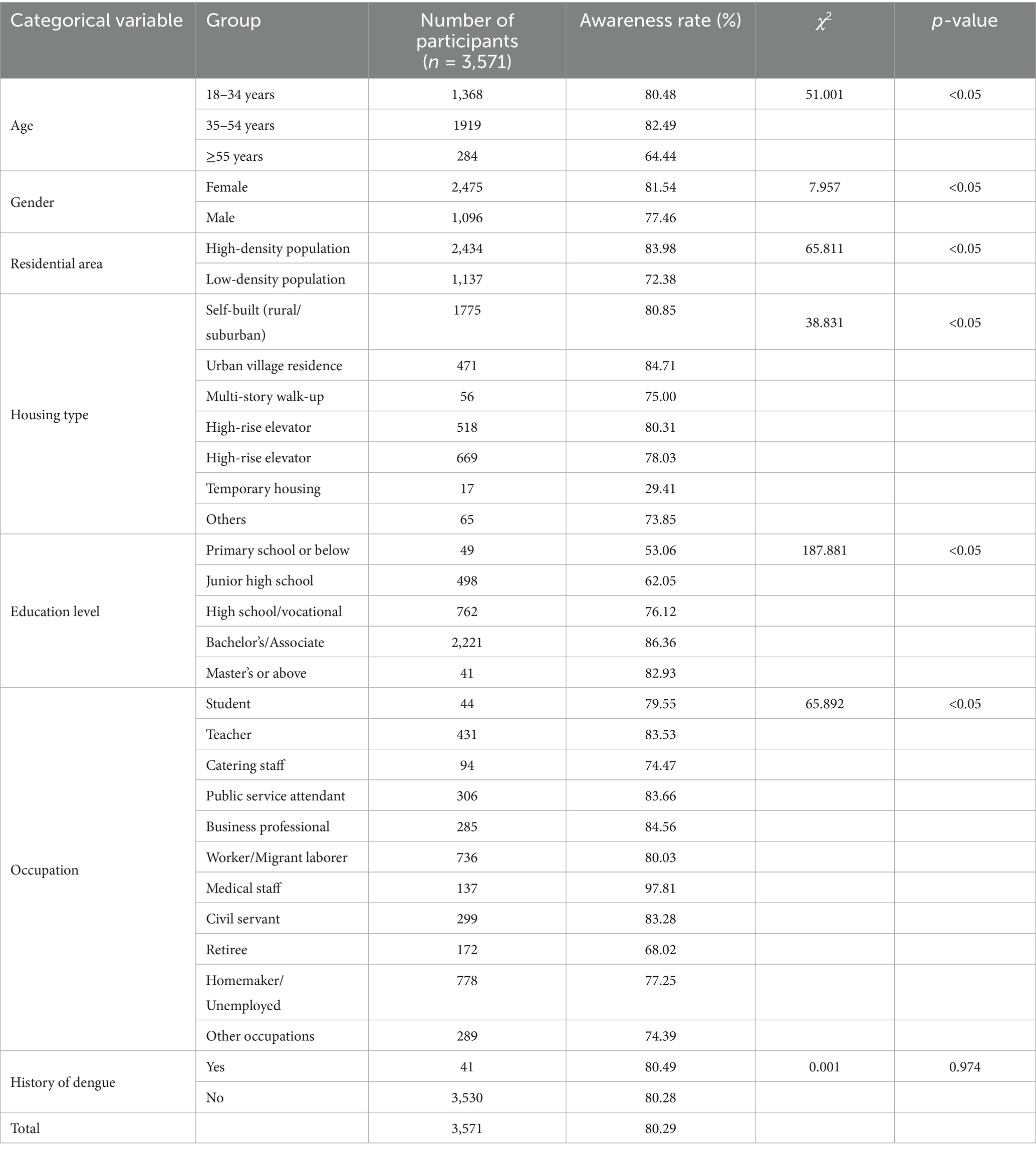 The overall dengue knowledge awareness rate was 80.29%. Significant differences were found across age, gender, residential area, housing type, education level, and occupation (p < 0.05). For instance, residents aged 35–54 showed the highest awareness (82.49%), while those aged 55 and above had the lowest (64.44%). The results as shown in Table 1.