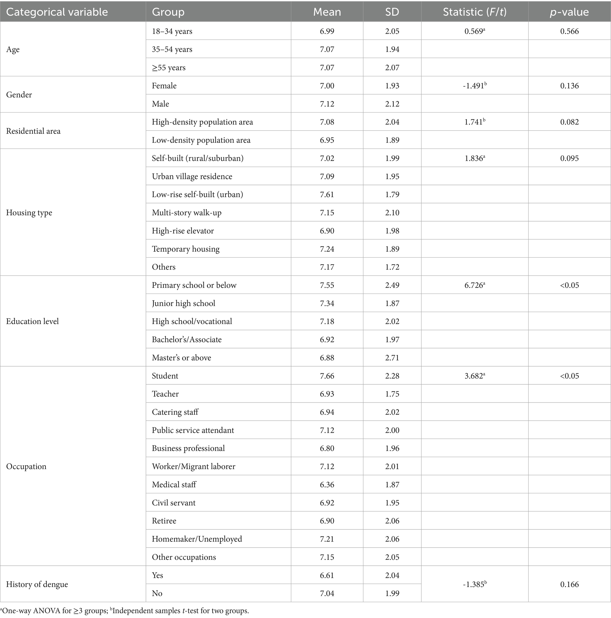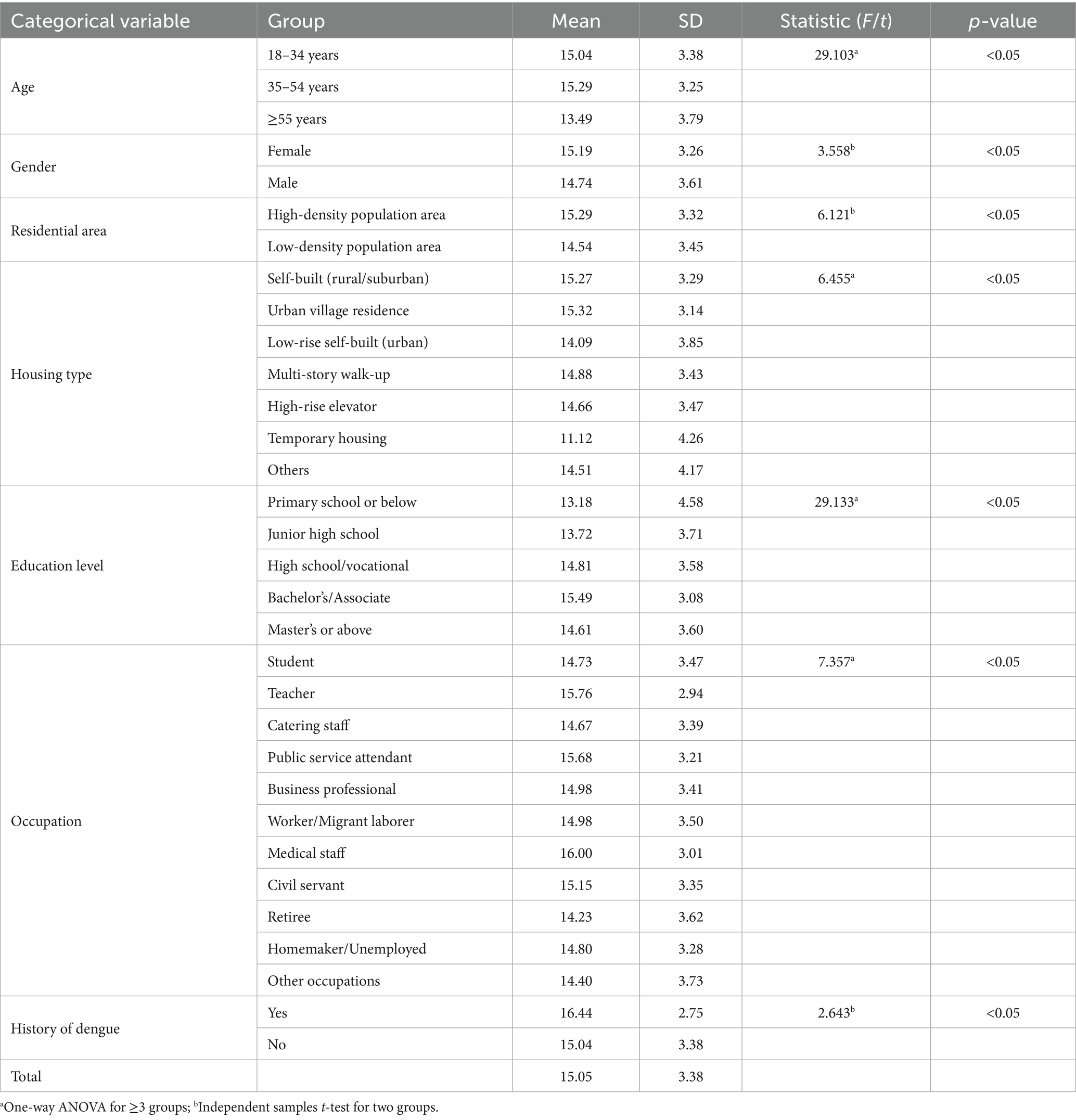 In this study, variations in dengue prevention behavior scores were observed among individuals of different ages, genders, residential areas, housing types, literacy levels, occupational categories, and prior experiences with dengue fever. Notably, lower levels of preventive behaviors were identified among residents aged 55 years and older, males, those residing in low-density populated areas, individuals living in temporary housing facilities, those with an education level of elementary school or below, retirees, and those who had not previously contracted dengue fever (37, 38). Compared to other age groups, individuals aged 55 years and above exhibited lower levels of dengue prevention behaviors, potentially attributable to factors such as historical environmental influences, a relative lack of health awareness within this demographic, and inadequate hygiene practices in their daily lives, which collectively contributed to their reduced mosquito prevention behaviors. Furthermore, the preventive behavior scores of females were higher than those of males, aligning with the findings of Ahmed (39).