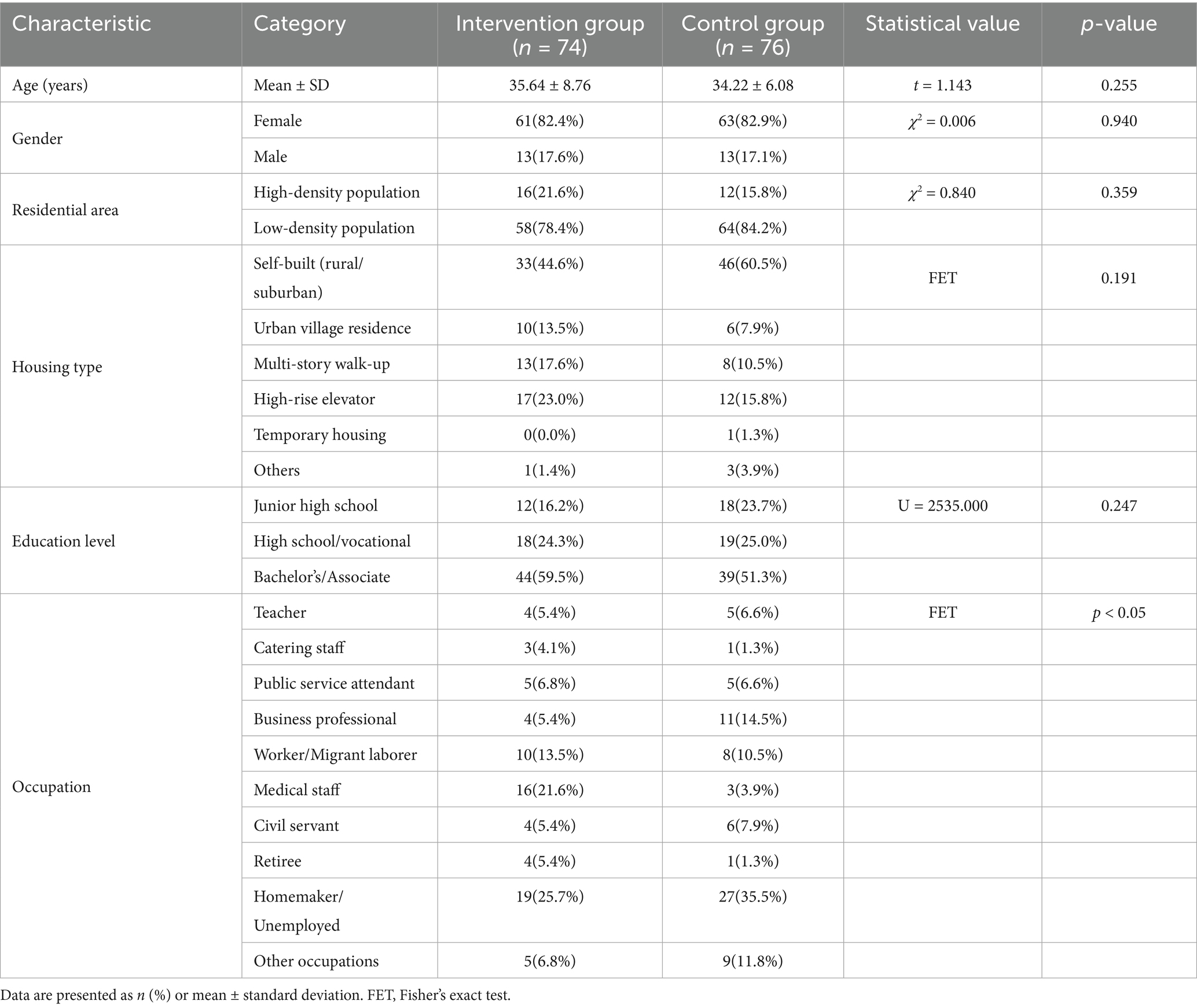A total of 167 questionnaires were distributed online for the quasi-experimental phase. After excluding invalid responses, we obtained 150 valid questionnaires, achieving a response rate of 89.82%. The intervention group comprised 74 participants, while the control group included 76 participants. The two groups were largely comparable at baseline, with no statistically significant differences were observed in most demographic characteristics. The results as shown in Table 4.