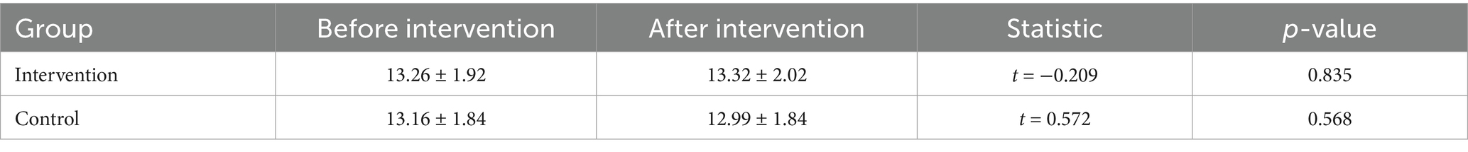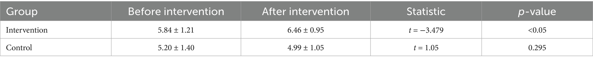 The intervention group showed a significant increase in knowledge scores post-intervention (p < 0.05), with scores rising from 5.84 ± 1.21 to 6.46 ± 0.95. The results as shown in Table 5.