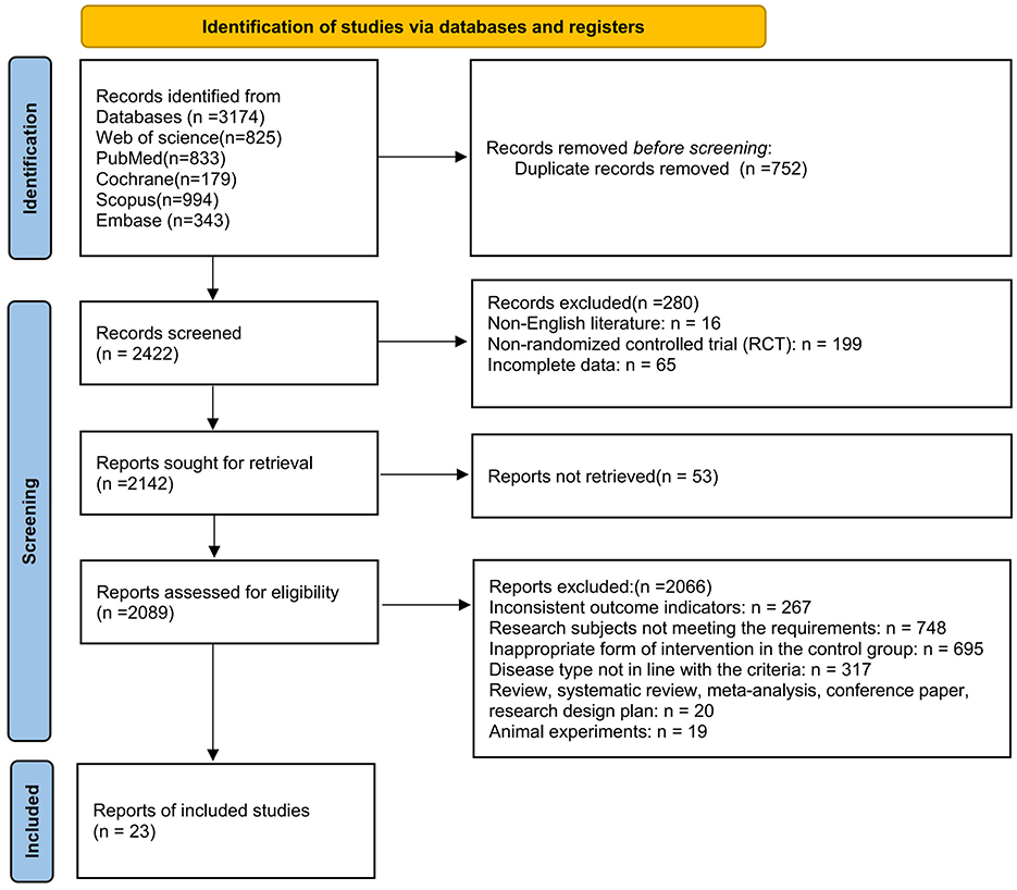 A total of 3,174 records were identified through the PubMed, Embase, Scopus, Web of Science, and Cochrane Library databases. The PRISMA flow diagram summarizing the study selection process is presented in Figure 1. After removing duplicates, screening titles and abstracts, and excluding studies not meeting the eligibility criteria, 23 articles were included (17–39), comprising 31 randomized controlled trials (RCTs).