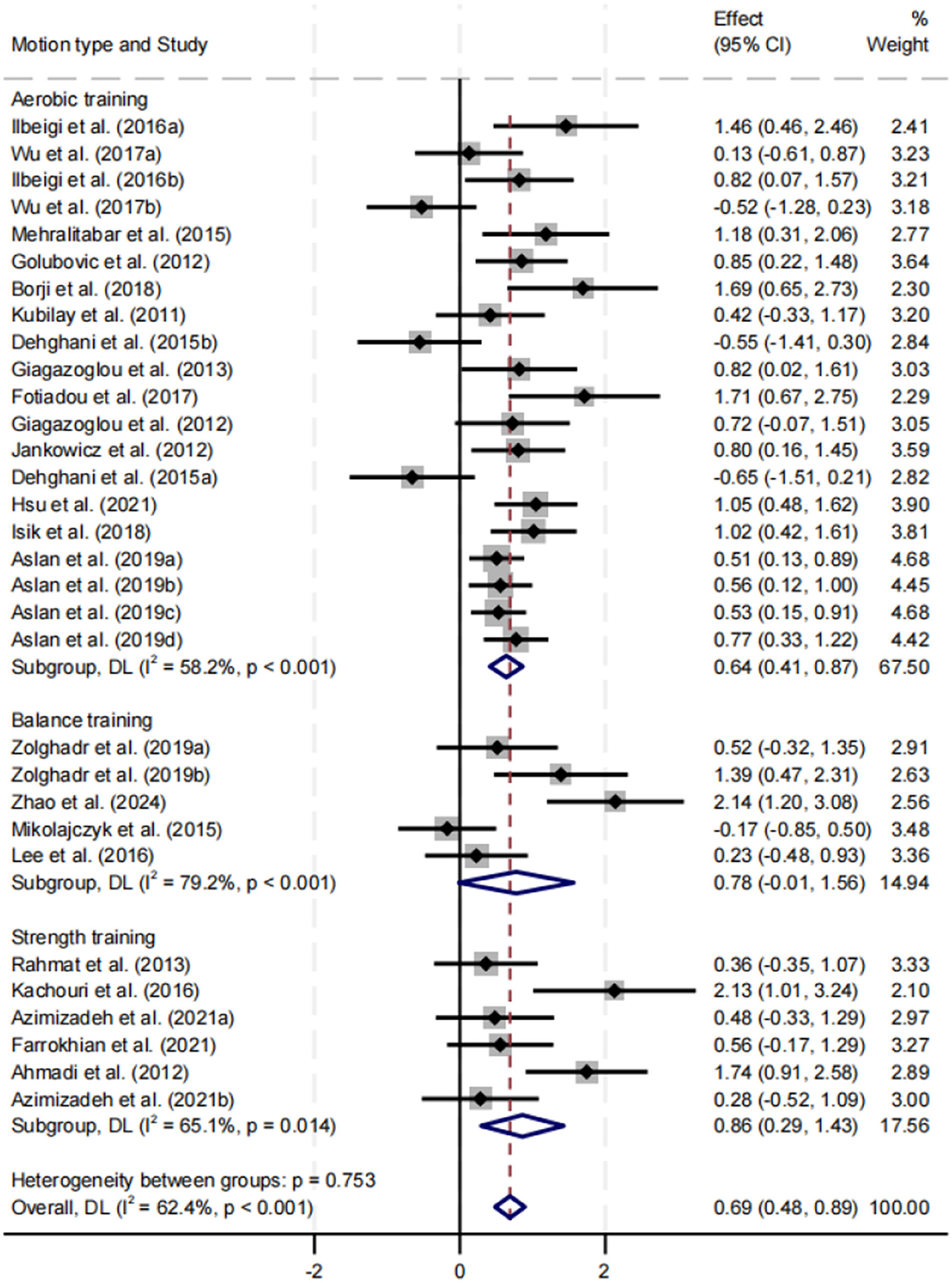 Subgroup analysis was stratified by aerobic training, balance training, and strength training (Figure 8). All three intervention types significantly improved balance performance, with SMDs of 0.64, 0.78, and 0.86, respectively (p < 0.05). Strength training yielded the largest effect size, while balance training exhibited the highest heterogeneity (I2 = 79.2%). No statistically significant differences were found between subgroups (p = 0.753).