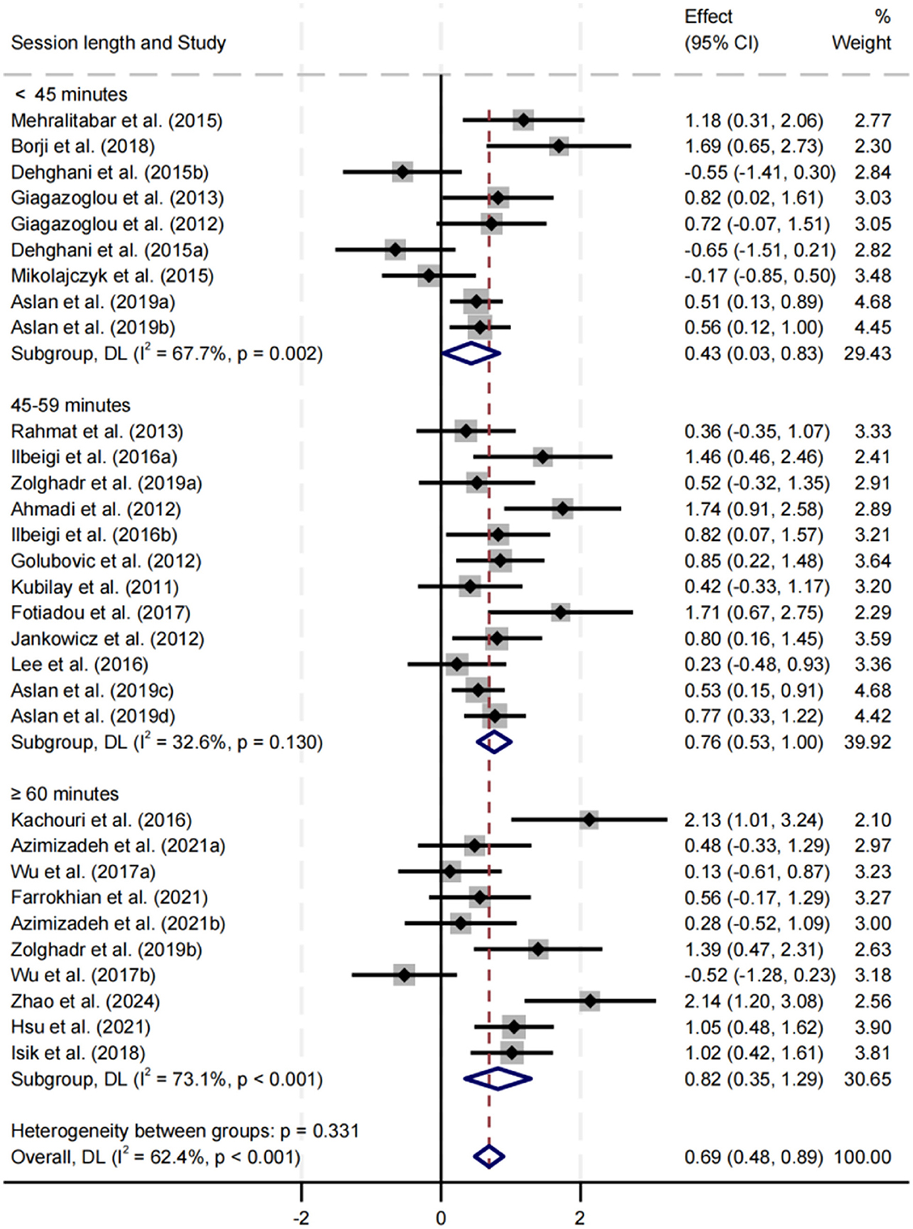 Subgroup analysis was conducted for session lengths of < 45, 45–59, and ≥60 min (Figure 10). All three durations significantly improved balance performance, with SMDs of 0.43, 0.76, and 0.82, respectively (p < 0.05). The ≥60 min group had the largest effect size, while the 45–59 min group exhibited the lowest heterogeneity (I2 = 32.6%). Differences between subgroups were not statistically significant (p = 0.331).