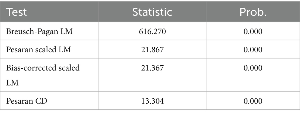 Cross-sectional dependency (CSD) refers to the correlation of error terms across panel units, often arising from common shocks, spillover effects, or unobserved global factors (90). Ignoring CSD can lead to biased and inconsistent estimators in panel regressions. One common method to detect cross-sectional dependence (CSD) is by applying the Lagrange Multiplier (LM) test, as shown in Equation 2, and the Cross-sectional Dependence (CD) test, as shown in Equation 3: