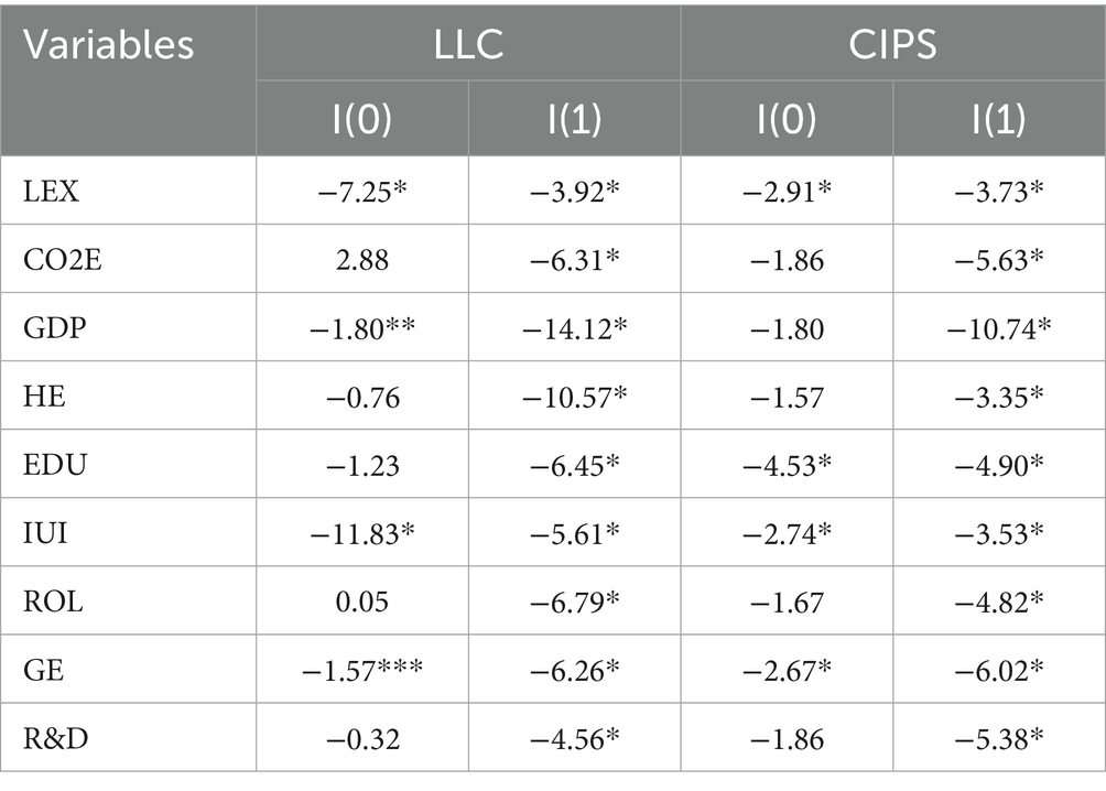 Table 5 presents the results of the LLC and CIPS unit root tests. In the LLC test, at level, LEX, GDP, IUI, and GE are stationary, while in the CIPS test, at level, LEX, EDU, IUI, and GE are stationary. After the first difference, both tests confirm that all variables are stationary at first differences.