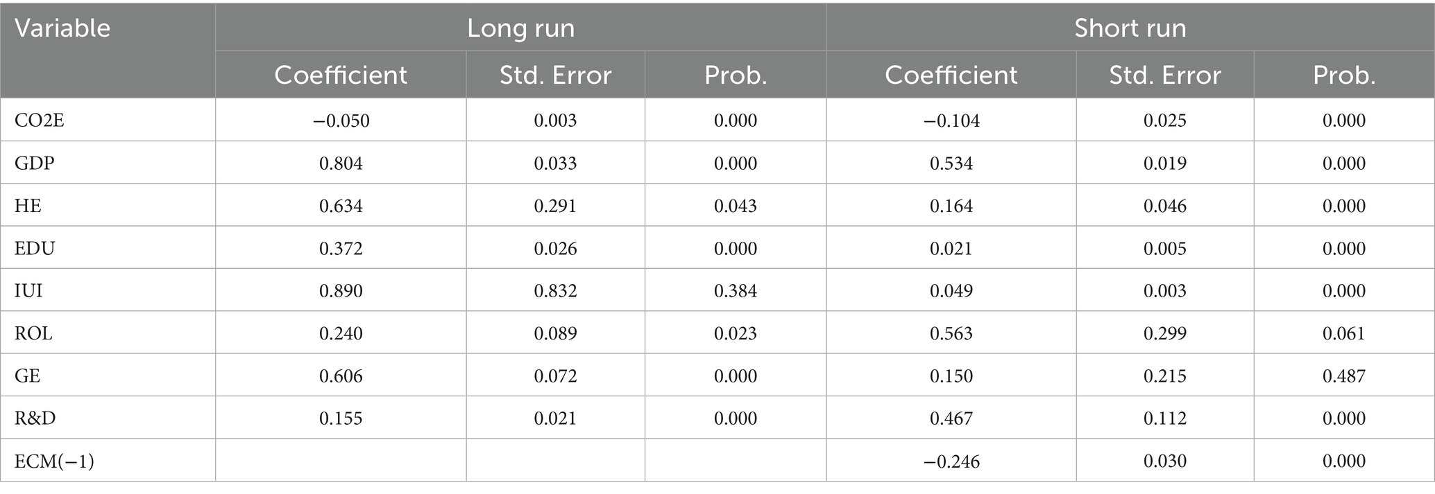 Table 6 shows the Kao residual cointegration test, The Kao test statistic (−2.3659, p = 0.009) is significant, rejecting the null hypothesis of no cointegration. This implies a long-run equilibrium relationship exists among the variables in the panel. The residual variance (0.1274) indicates the average variation of the residuals. The HAC variance (0.0828) provides a robust estimate, confirming the stability of the long-run relationship.