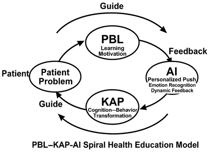 In the PBL-KAP-AI Spiral Health Education Model, artificial intelligence (AI) plays a crucial role. The AI platform analyzes patients’ clinical, demographic, and behavioral data to deliver personalized health education tasks and activities, such as micro-courses, case simulations, and group discussions. The content is dynamically adjusted based on the patient’s needs and progress. Additionally, AI integrates multimodal emotion and behavior recognition technologies to monitor patients’ emotional fluctuations in real time and adjusts the educational content accordingly, ensuring the precision and effectiveness of the intervention. Furthermore, by collecting patients’ interaction data, AI optimizes the frequency and pathways of content delivery, enhancing intervention effectiveness. The AI-driven incentive mechanisms also boost patients’ learning motivation, facilitating the transformation of health behaviors and improving self-management capabilities.