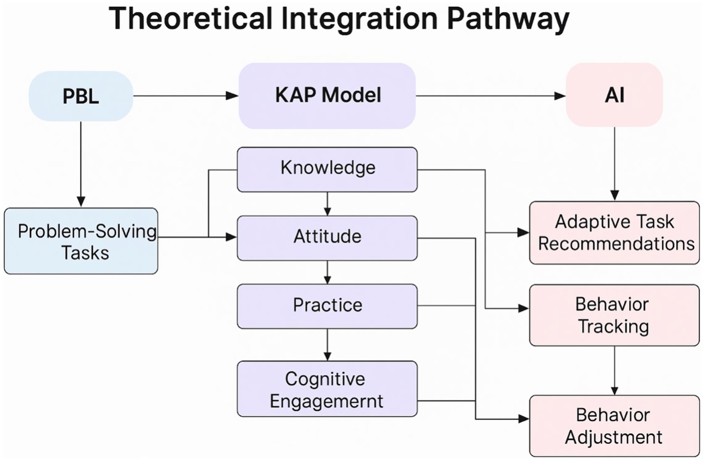 As illustrated in Figure 3, the model integrates Problem-Based Learning (PBL), the Knowledge–Attitude–Practice (KAP) pathway, and AI-driven adaptive mechanisms to construct a closed loop of “cognitive activation → attitude internalization → behavioral transformation → feedback optimization.”