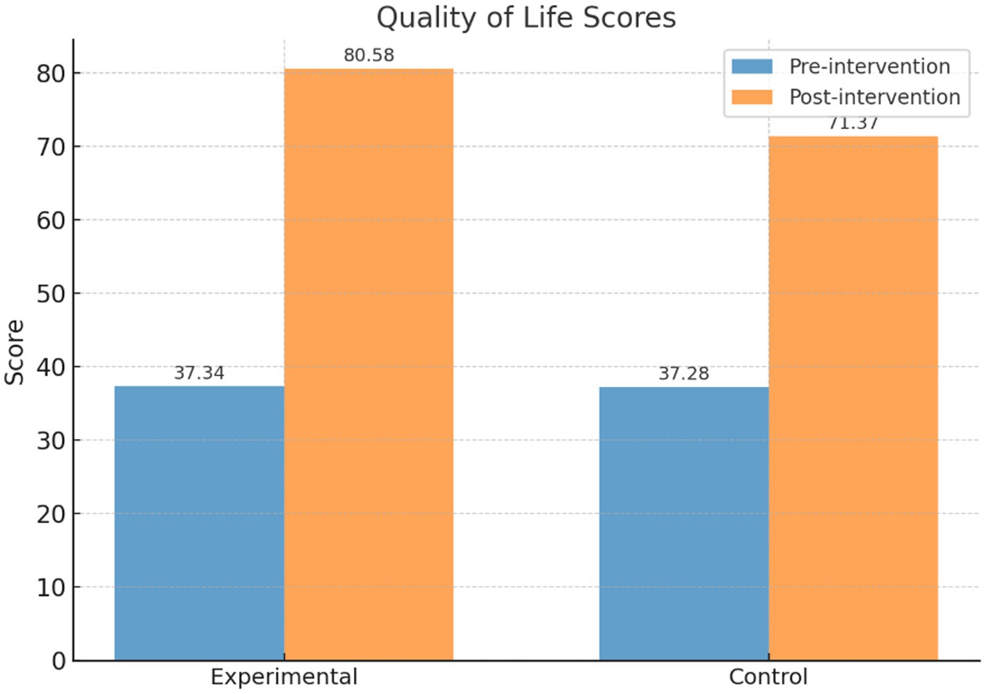 As shown in Table 2, prior to the intervention, the quality of life scores for the intervention and control groups were 37.34 ± 11.17 and 37.28 ± 10.29, respectively, with no statistically significant difference (t = 0.07, p = 0.95). After the intervention, the intervention group’s score significantly increased to 80.58 ± 7.28, while the control group’s score increased to 71.37 ± 10.21. The difference between the two groups was statistically significant (t = 11.47, p < 0.001). Within-group comparisons also revealed significant improvements for both the intervention group (t = 52.08) and the control group (t = 35.93, p < 0.001) after the intervention.