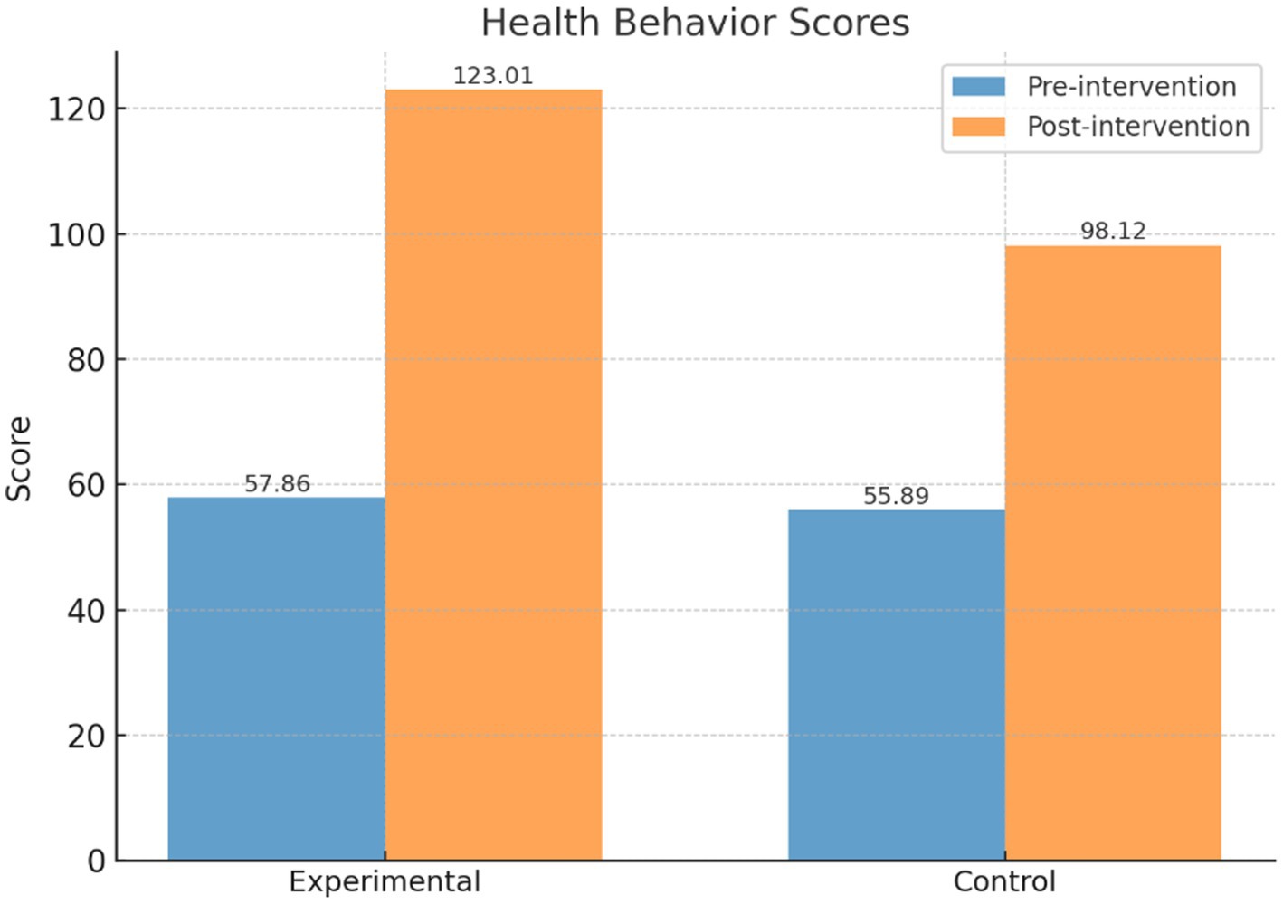 As shown in Table 3 and Figure 5, prior to the intervention, the health behavior score of the intervention group (n = 244) was 57.86 ± 11.72, which significantly increased to 123.01 ± 9.90 post-intervention, with a statistically significant difference (t = 64.60, p < 0.001). The control group (n = 244) had a pre-intervention score of 55.89 ± 10.13, which increased to 98.12 ± 7.96 post-intervention, with a significant difference as well (t = 52.43, p < 0.001).