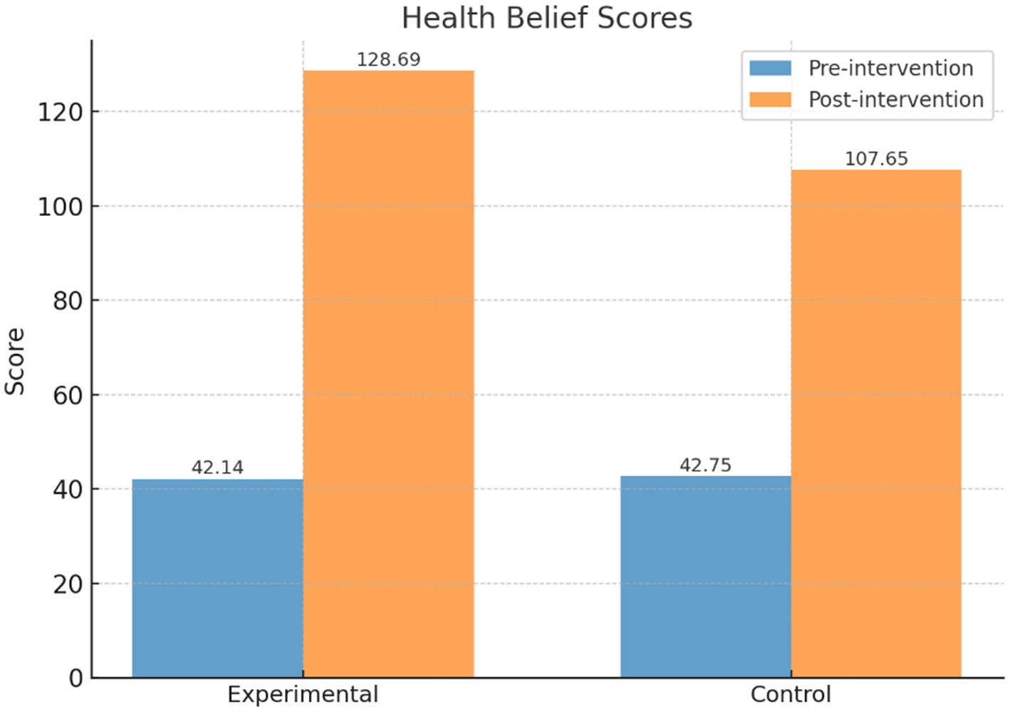 As shown in Table 4 and Figure 6, there was no statistically significant difference between the two groups before the intervention (intervention group: 42.14 ± 7.64, control group: 42.75 ± 4.93, t = 1.04, p = 0.30). After the intervention, the intervention group’s health belief score significantly increased to 128.69 ± 15.89, while the control group’s score also increased to 107.65 ± 16.24. The difference between the two groups was statistically significant (t = 14.47, p < 0.001). Within-group comparisons also showed significant improvements in both groups (intervention group: t = 88.93; control group: t = 60.43, p < 0.001).