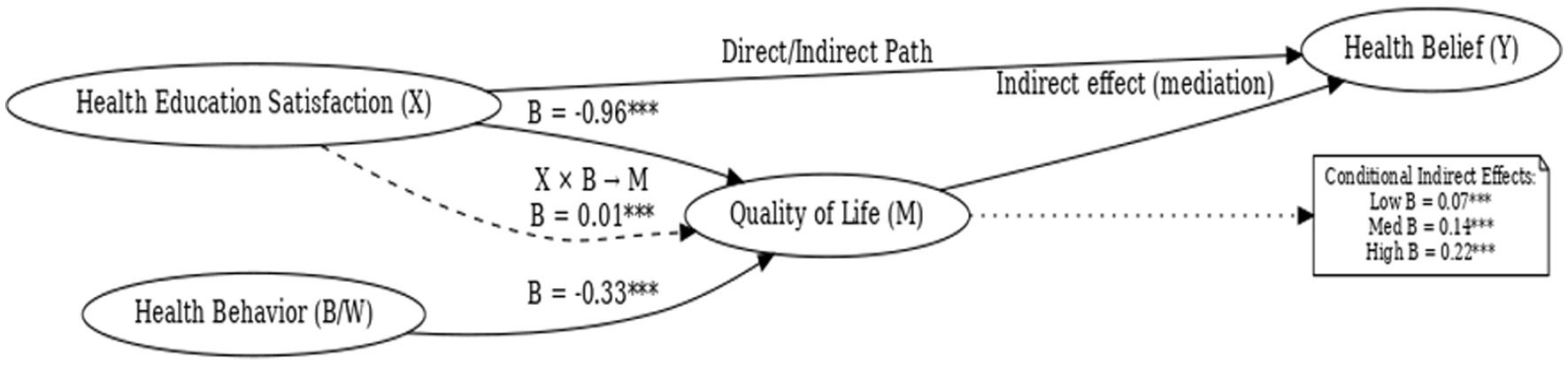Figure 7. Moderated mediation model of health education satisfaction, quality of life, health belief, and health behavior.