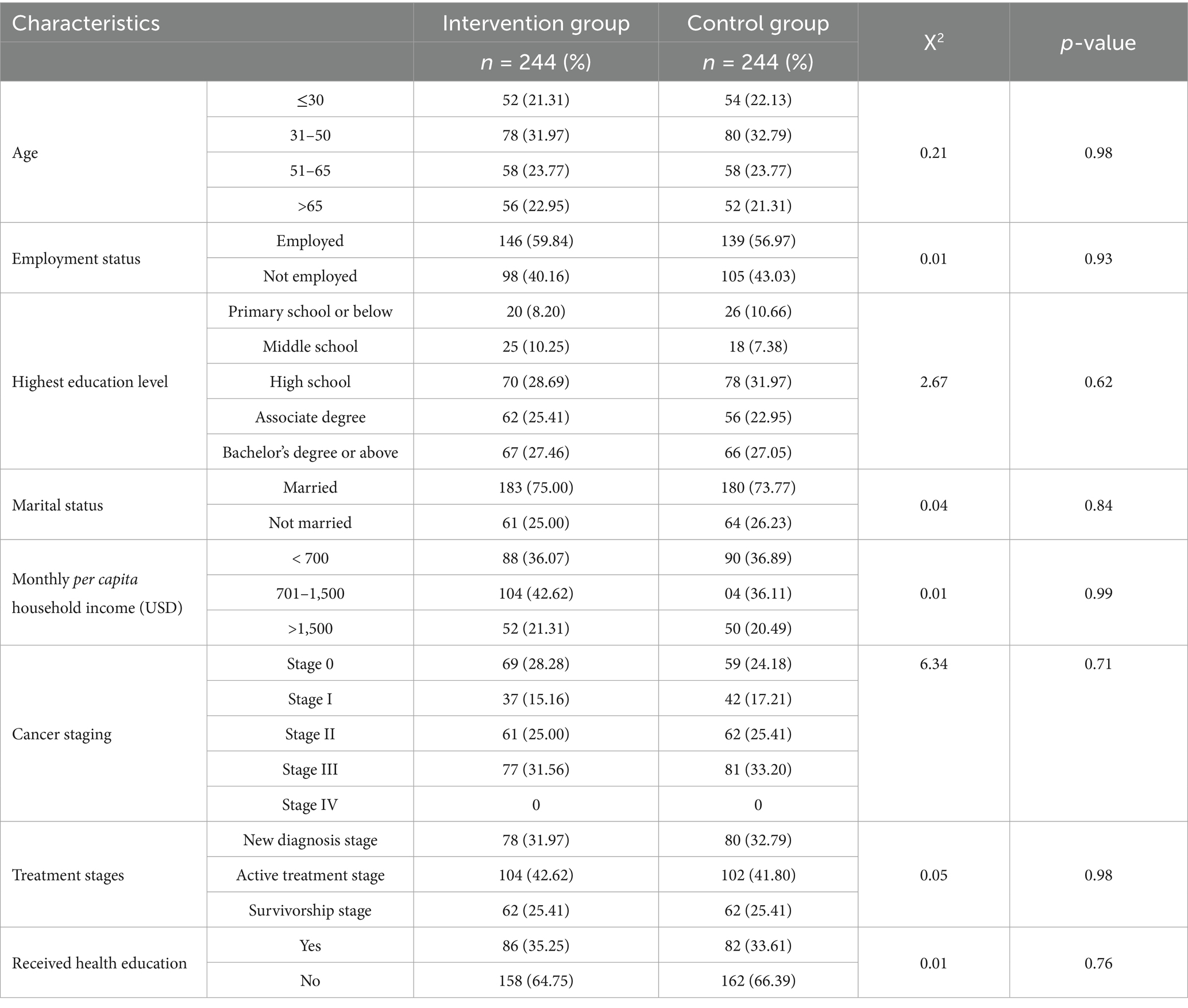 A total of 488 patients were included in this study. After signing the informed consent form, participants were randomly assigned to either the intervention group or the control group using a computer-generated random number table, with 244 participants in each group. To maintain allocation concealment, sequentially numbered opaque sealed envelopes were used to ensure that the assignment process was unpredictable to the researchers, thereby preventing selection bias. Blinding was applied during the allocation process, ensuring that the researchers were unaware of the group assignments, reducing the risk of selection bias and ensuring the randomness and fairness of the allocation.