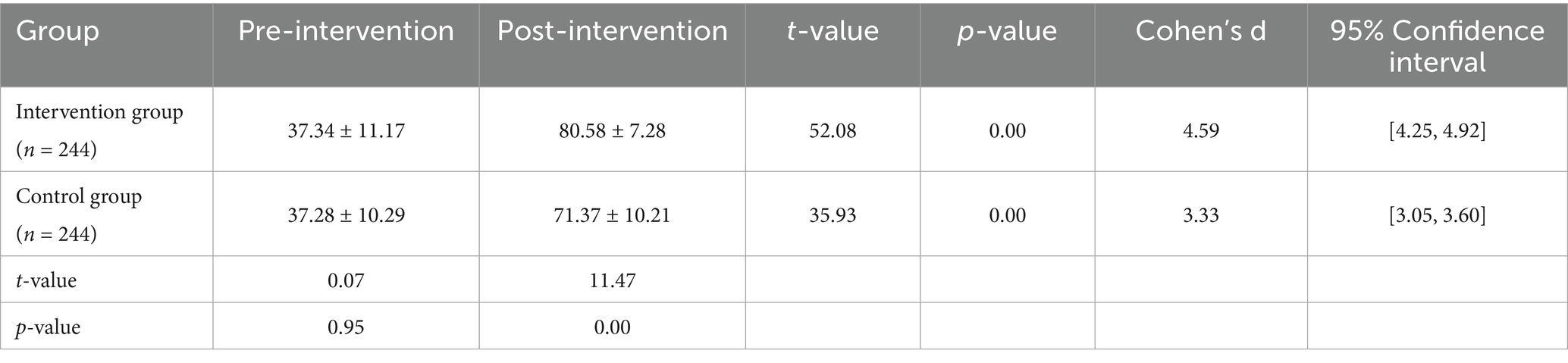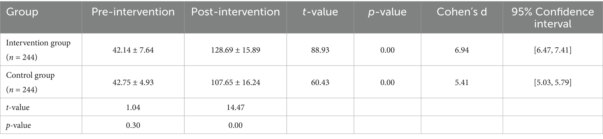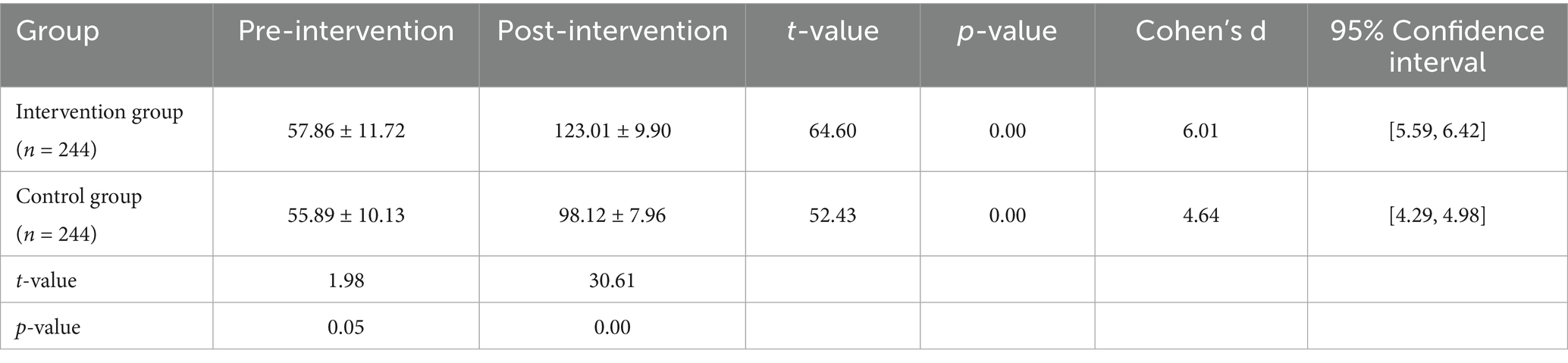 Further comparison of post-intervention differences between the two groups showed that the intervention group scored significantly higher than the control group (t = 30.61, p < 0.001), indicating that the PBL-KAP-AI spiral health education model had a significant positive effect on improving health behaviors.