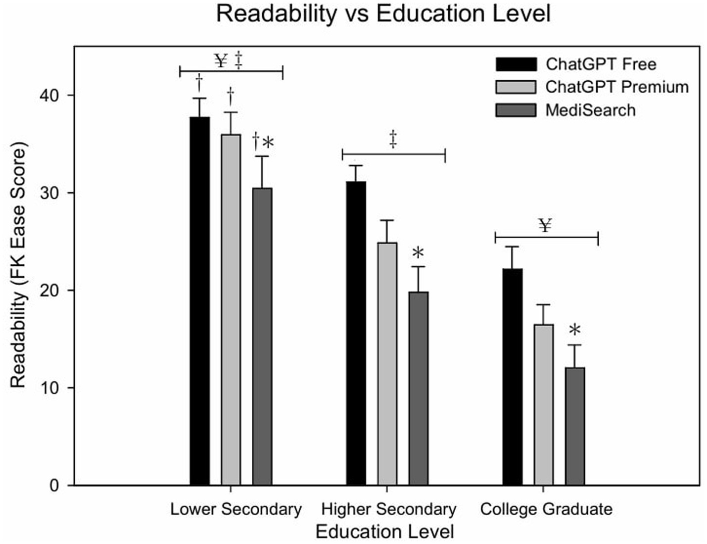 Figure 1. Readability of AI-generated responses across education levels. Mean Flesch–Kincaid Ease Scores for each AI model across education level. Error bars represent the standard error of the mean (SEM) with significant relationships marked by symbols: (*) indicates significance from ChatGPT Free within education level; (†) indicates significance from higher secondary education within tool; (¥) indicates significance from higher secondary education collapsing across education levels; (‡) indicates significance from college graduate collapsing across education levels.