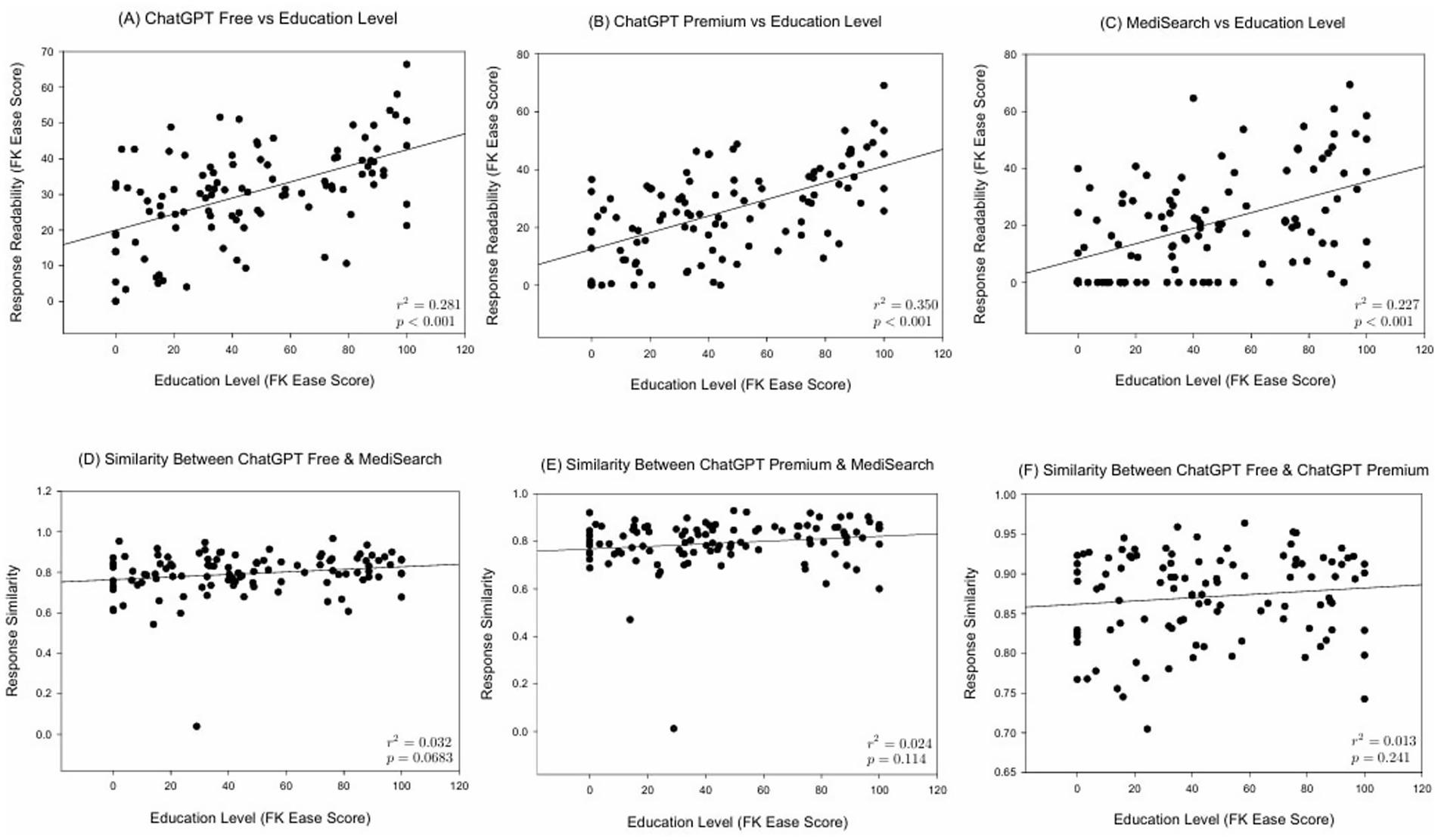 Figure 2. Correlations between education level and both readability and similarity metrics. Scatter plot illustrating the relationship between education level and (A) the Flesch–Kincaid Ease Score of ChatGPT Free responses, (B) the Flesch–Kincaid Ease Score of ChatGPT Premium responses, (C) the Flesch–Kincaid Ease Score of responses generated by MediSearch, (D) similarity scores between ChatGPT Free and MediSearch, (E) similarity scores between responses generated by ChatGPT Premium and MediSearch, and (F) similarity scores between responses from ChatGPT Premium and ChatGPT Free.