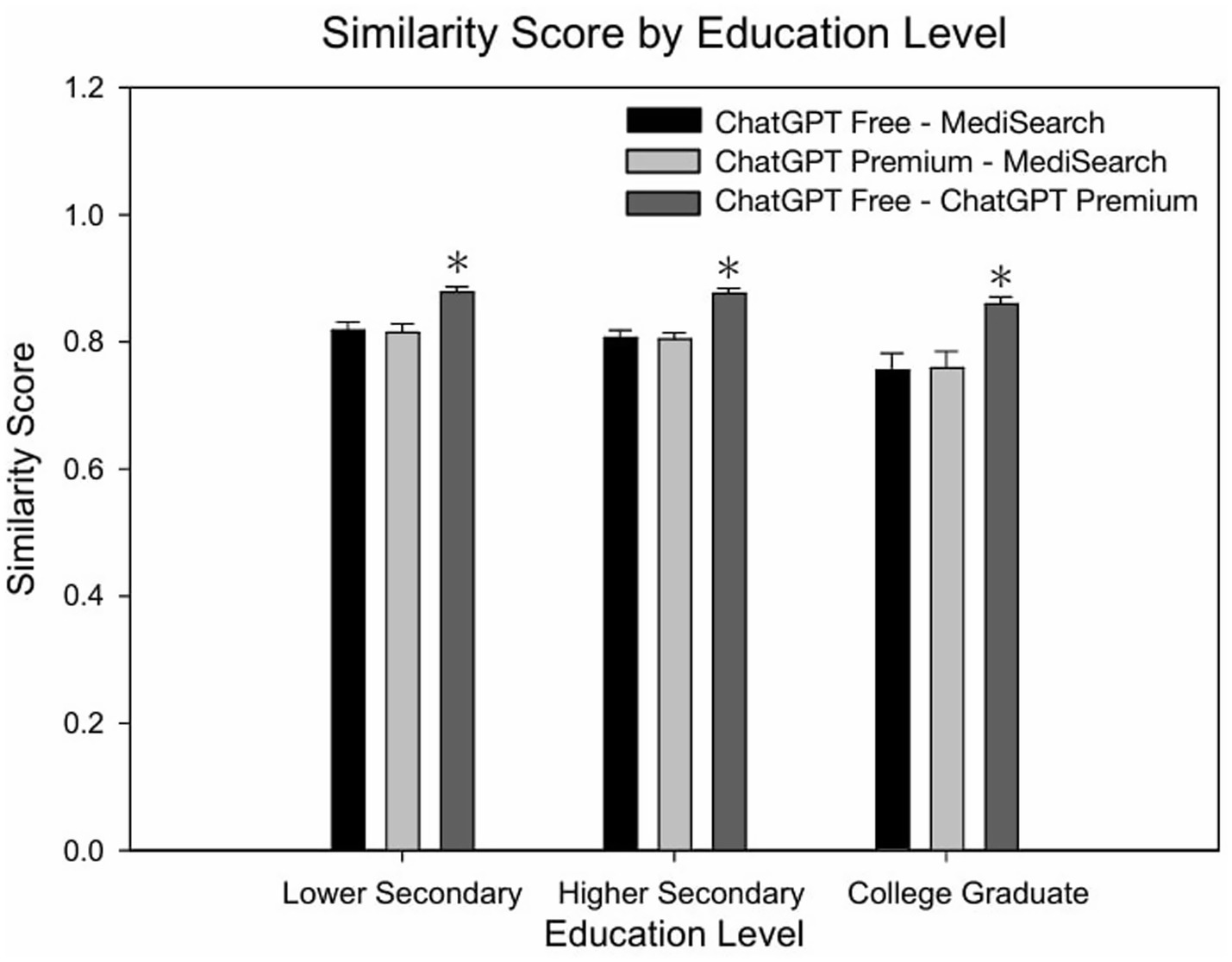 Figure 3. Similarity of AI-generated responses across education levels. Mean similarity scores for each AI model comparison across education levels. Error bars represent the standard error of the mean (SEM) with significant relationships marked by the symbol: (*) indicating significance from lower secondary and higher secondary within education level.