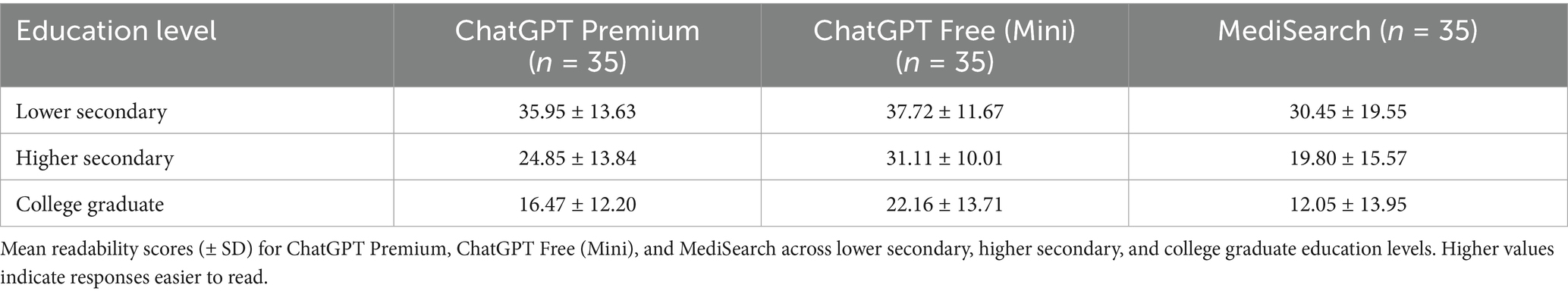 Data from the present investigation indicates that ChatGPT Premium can explain ~35% of the variance in the Flesch–Kincaid Ease Score of ChatGPT Premium responses; therefore, ChatGPT premium is the strongest predictor of readability when correlated with education level among all AI models. ChatGPT Free explains ~28% of the variance in readability across education levels, and MediSearch explains ~23%, making it the weakest predictor, although statistically significant (p < 0.001). Nonetheless, the findings from the present investigation indicate that individuals with higher education levels engage with the models in a more intricate way, leading to differences in how each model generates a response. An important implication of this finding is that NLP-model generated content could be considered more uniform and less tailored to nuanced inquiries from those with lower educational backgrounds, leading to concerns of oversimplification or misinterpretation. Conversely, the variability of responses at higher education levels may suggest that models struggle to provide consistent responses to more sophisticated questions, opening the door to inaccuracies and misinterpretation. It is important to emphasize that nuances in responses as a result of prompt input because this study used education level to assess readability, but education level may not necessarily correspond to medical literacy. Even though increased education generally corresponds to increased medical literacy (34), some people with advanced degrees may have low health literacy as input prompts at a lower level than their education would indicate.