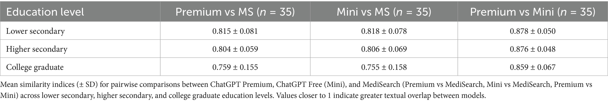 Figure 3 depicts the mean similarity score by education level which further exemplifies the similarity between both ChatGPT models versus the decreased similarity between either ChatGPT model with MediSearch, consistent across education levels. Specifically, the similarity between ChatGPT Free and MediSearch differed significantly from the similarity between ChatGPT Free and ChatGPT Premium for users with lower secondary education (p = 0.002), higher secondary education (p < 0.001), and college graduate education (p = 0.005). Additionally, the similarity between ChatGPT Premium and MediSearch was statistically different from the similarity between ChatGPT Free and ChatGPT Premium for users with lower secondary education (p < 0.001), higher secondary education (p < 0.001) and college graduate education (p = 0.006). In contrast, no statistical significant correlations between education level and the similarity between ChatGPT Free versus MediSearch (Figure 2D; r = 0.161, p < 0.102), ChatGPT Premium versus MediSearch (Figure 2E; r = 0.144, p < 0.136), nor ChatGPT Premium versus ChatGPT Free (Figure 2F; r = 0.104, p = 0.291) were observed.