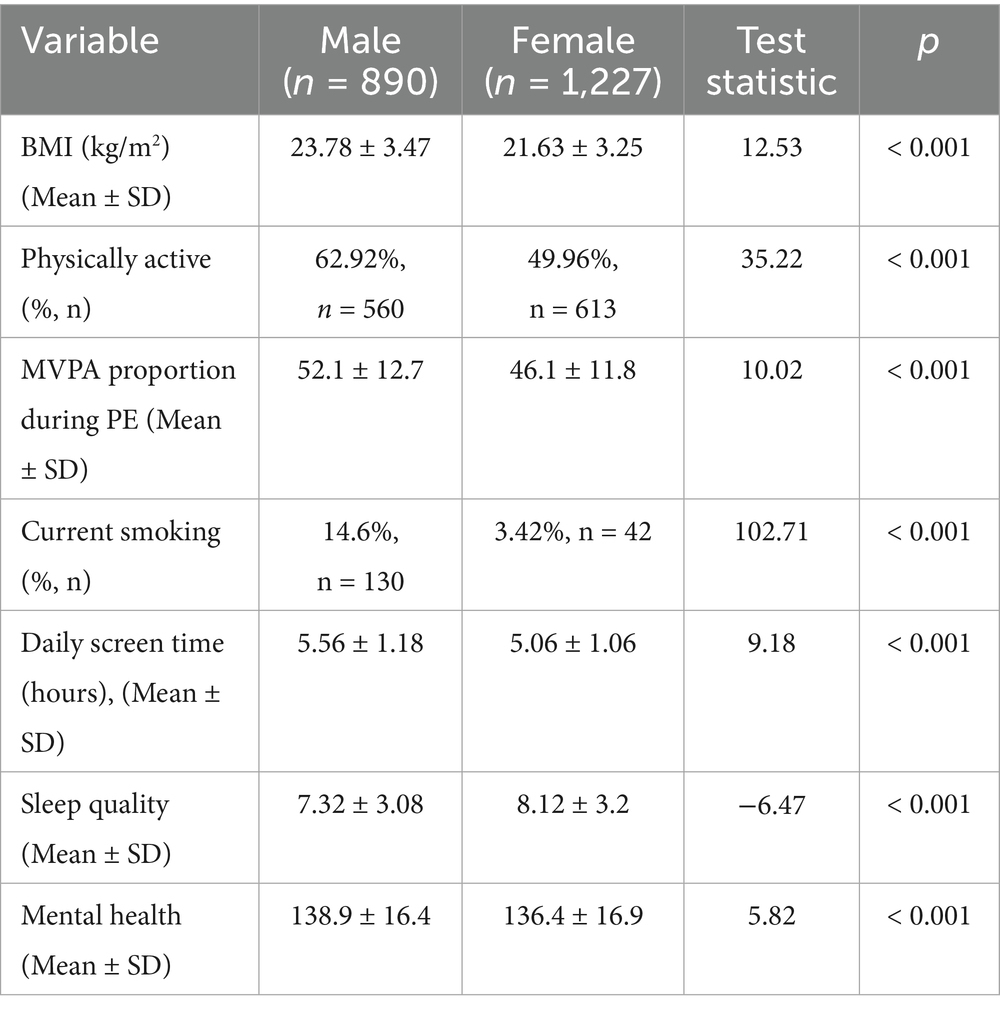 A total of 2,117 valid questionnaires were collected from 2,953 distributed, yielding a response rate of 71.68% (age: 20.59 ± 0.62 years; female: 57.96%). Figure 1 shows the characteristics of the participants. 15.77% of students rated their financial status as good. 31.22% of students were overweight and obese (BMI ≥ 24) and 55.41% met the recommended physical activity level. The proportion of PE lesson time spent in MVPA was 48.62% ± 12.31%. Most students were non-smokers (91.87%) and 38.5% of students classified as having poor sleep quality. The mean daily screen time was 5.28 ± 1.12 h and mental health score was 137.47 ± 16.73, indicating generally positive mental health values in this population.