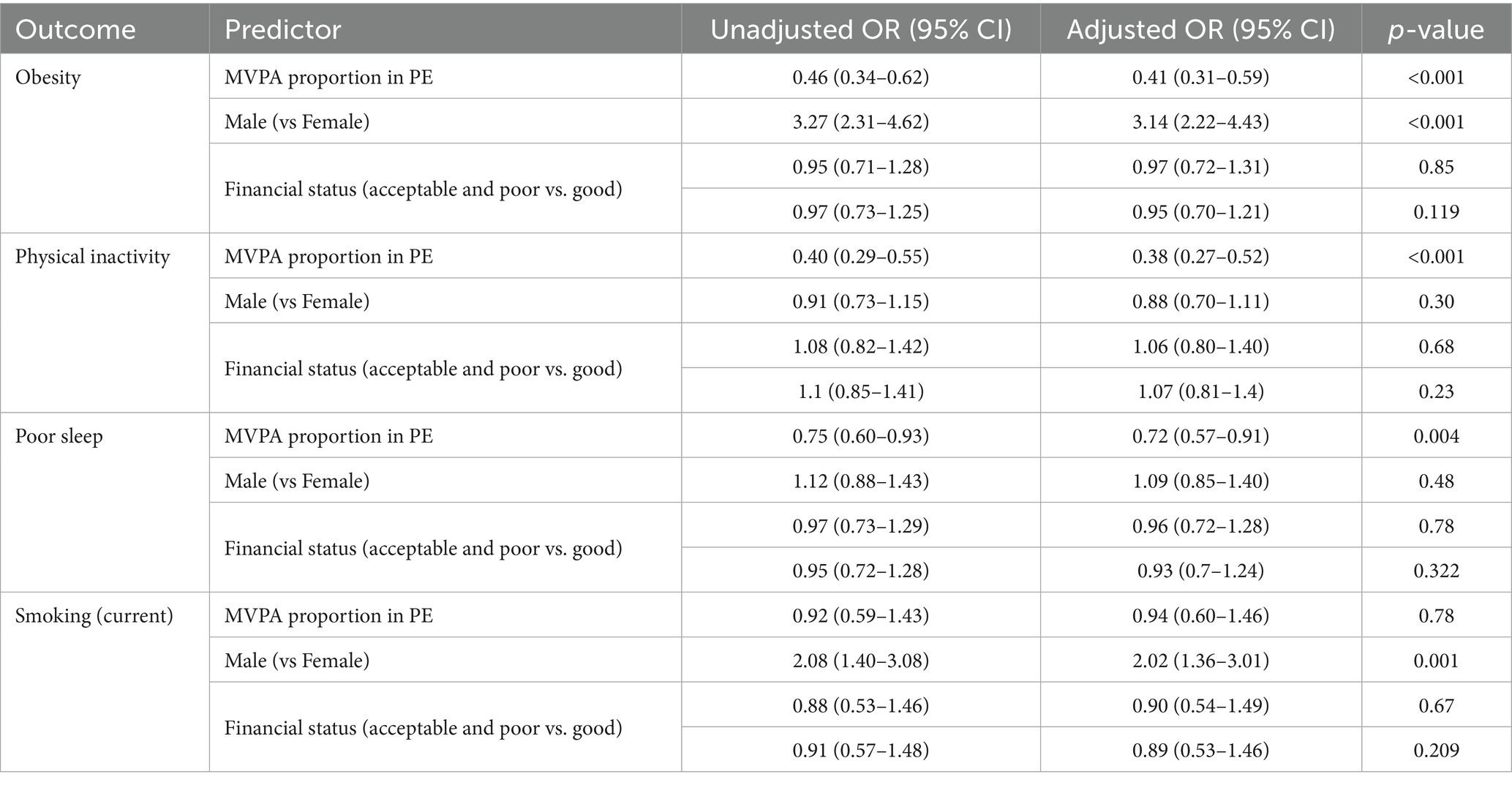 The univariate and multivariate logistic regression analyses were conducted to examine predictors of obesity (BMI ≥ 28), physical inactivity (total physical activity <600 MET-min/week), poor sleep quality (PSQI ≥8), and current smoking status (Table 3). In the multivariate models, a higher proportion of MVPA during PE lessons was significantly associated with lower odds of obesity (adjusted OR = 0.41, 95% CI: 0.31–0.59, p < 0.001), physical inactivity (adjusted OR = 0.38, 95% CI: 0.27–0.52, p < 0.001), and poor sleep quality (adjusted OR = 0.72, 95% CI: 0.57–0.91, p = 0.004). Also, male students had higher odds of obesity (OR = 3.14, 95% CI: 2.22–4.43, p < 0.001) and smoking (OR = 2.02, 95% CI: 1.36–3.01, p = 0.001).