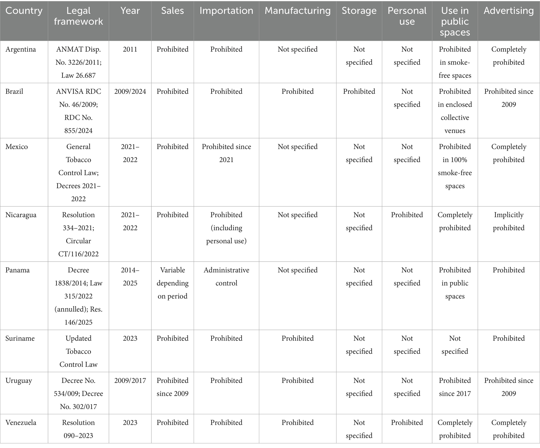 Policy responses across Latin American nations are fragmented and fall into three main models: total prohibition, partial regulation, and regulatory inaction. For clarity, I summarized these categories—derived from WHO FCTC reports and regional legal frameworks—in comparative tables rather than long country lists in the main text (Tables 1–3). Eight countries—including Argentina, Brazil, Mexico, Uruguay, and Venezuela—have implemented complete bans on sales, imports, and promotion, extending restrictions to public use and advertising, with several of these provisions reaffirmed or updated during the late 2020s (21–25) (Table 1). In contrast, 13 countries such as Chile, Colombia, Costa Rica, Ecuador, Paraguay, and Peru have adopted partial measures, while several others still lack specific frameworks. These include restrictions on sales to individuals under 18, prohibitions on use in smoke-free environments, and advertising limitations, but with substantial gaps in critical areas such as taxation and health product registration (21, 26, 27) (Table 2). Meanwhile, 14 states—including the Dominican Republic, Guatemala, Honduras, El Salvador, and Bolivia—still lack specific regulatory frameworks, leaving commercialization virtually unrestricted and facilitating market penetration into vulnerable populations (28) (Table 3). This regulatory heterogeneity is summarized across Tables 1–3, which compare current legal measures across the region.