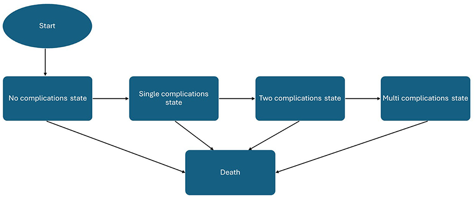 The model followed a hypothetical cohort of 1,000 adults whose baseline characteristics were aligned with those of the STEP 8 clinical trial population (41), supplemented with clinical expert opinion where local adjustment was necessary. Health states included no complication, single complications (acute coronary syndrome, type 2 diabetes, hypertension, dyslipidemia, asthma, chronic kidney disease, and sleep apnea), combined complications, and death. All patients enter the model in the “no complications” state, characterized by their baseline BMI, demographic characteristics, and utility value. During each cycle, individuals could transition from the non-complication state to one of the single-complication states, representing the first onset of type 2 diabetes, acute coronary syndrome (myocardial infarction or unstable angina), hypertension, dyslipidemia, asthma, sleep apnea, or chronic kidney disease. From there, patients could progress into multi-morbidity states, defined as the coexistence of two or three of these comorbidities, thereby reflecting the clustering of obesity-related diseases observed in real-world populations. All health states were linked to an absorbing death state, allowing transitions from any condition to mortality according to age-, sex-, and risk-adjusted probabilities.