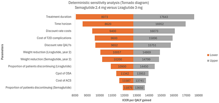 Deterministic sensitivity analyses (DSA) were conducted to assess the impact of parameter uncertainty on model outcomes by varying one parameter at a time while holding all others constant. Key clinical and economic inputs—including drug acquisition costs, complication costs, utility values, discount rate, and assumptions regarding post-treatment weight regain—were varied. When empirical measures of parameter uncertainty (e.g., standard errors or confidence intervals) were not available from published sources, a conservative range of ±25% was applied around the base-case value. This approach follows established practice in cost-effectiveness modeling and aligns with previous economic evaluations in obesity (21–24). The eleven most influential parameters were identified and ranked according to their effect on the incremental cost-effectiveness ratio (ICER), with results presented in a tornado diagram.