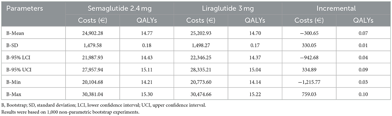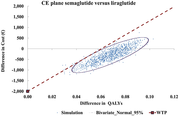 Uncertainty around these estimates was modest. The standard deviation of incremental costs was €330, with a 95% confidence interval (CI) ranging from €−943 to €335. For incremental QALYs, the standard deviation was 0.01, with a 95% CI of +0.04 to +0.09. Across all simulations, semaglutide consistently generated positive incremental QALYs (minimum +0.03, maximum +0.10).