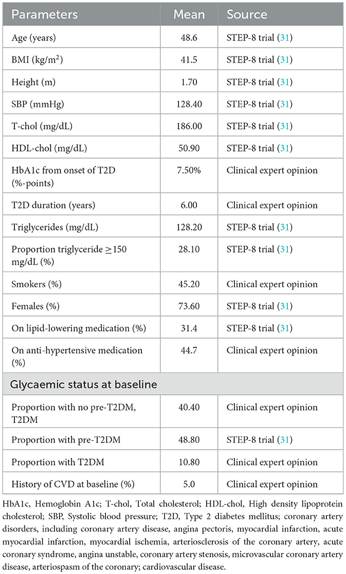Safety inputs were also derived from STEP-8 (41). Treatment-related adverse events (AEs) captured in the model included gastrointestinal events (e.g., nausea, vomiting, diarrhea) and non-severe hypoglycaemia. These were applied during active treatment, with discontinuations due to AEs transitioning patients onto the diet-and- exercise pathway.