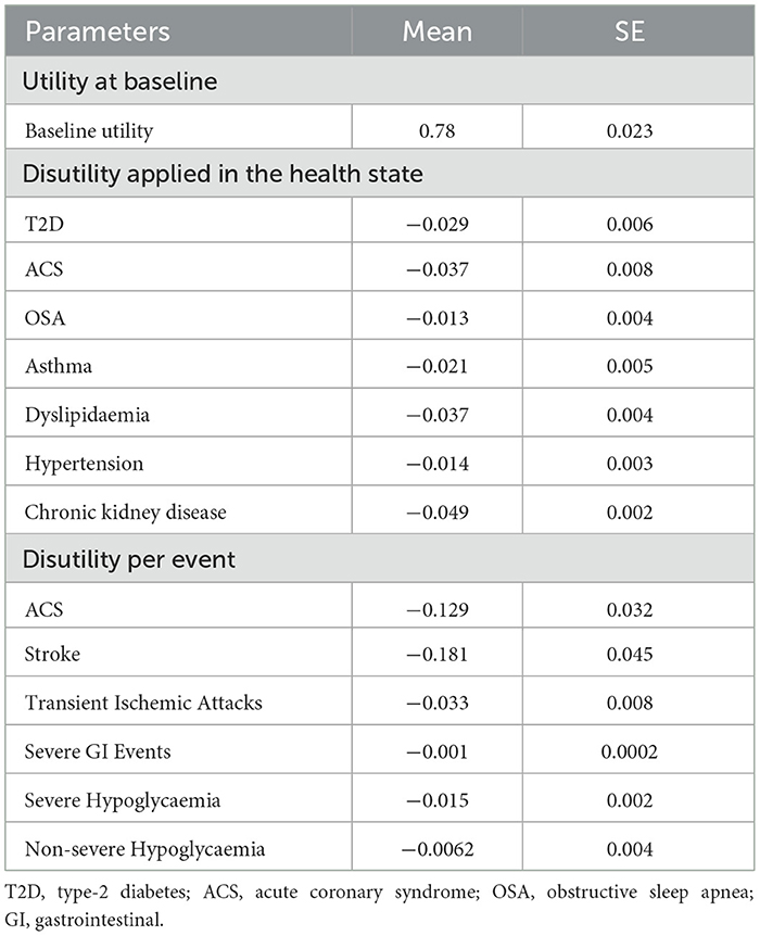 Utilities were dynamically updated in each cycle to reflect both BMI trajectories and the onset of comorbidities. As individuals transitioned into health states corresponding to obesity-related complications, condition-specific disutilities were applied additively to the baseline utility. Disutilities for chronic comorbidities were obtained from published literature (62–66). For acute events such as stroke or transient ischemic attack, temporary disutilities were applied in the cycle of occurrence. Treatment-related adverse events, primarily gastrointestinal symptoms and non-severe hypoglycaemia, were also incorporated as short-duration disutilities during active therapy, consistent with prior studies (21–24). The baseline utilities and disutilities applied in the model are reported in Table 2.