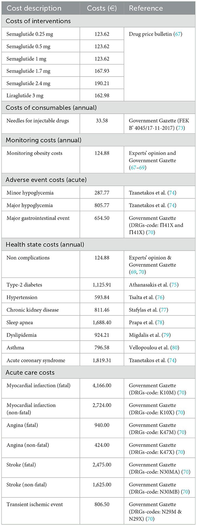Drug acquisition costs for semaglutide 2.4 mg and liraglutide 3.0 mg were obtained from the most recent official price bulletin (67). Payer costs were derived by applying the statutory 25% co-payment to retail prices, consistent with EOPYY reimbursement rules. The annual cost of obesity monitoring comprised three general practitioner visits, four visits to an obesity or surgical specialist, two visits to a dietitian/nutritionist, and three complete blood and urine panels per patient per year. Unit costs for visits and diagnostic tests were extracted from the Government Gazette and the EOPYY reimbursement schedule (68, 69). Costs associated with the treatment of obesity-related complications and with adverse events were sourced from published Greek literature and national unit cost databases. Acute event costs—including hospitalizations for acute coronary syndrome, stroke, or hypoglycemia—were retrieved from publicly available Diagnosis-Related Groups (DRGs) (70). All costs were expressed in 2025 euros. Where necessary, earlier cost estimates were adjusted to 2025 values using the Consumer Price Index (CPI) published by the Hellenic Statistical Authority (ELSTAT) (71). Table 3 illustrates the cost inputs used in the present analysis.