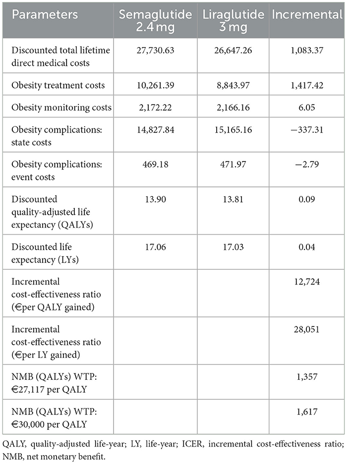 Results: Semaglutide 2.4 mg was associated with an incremental mean increase in quality-adjusted life expectancy of 0.09 at modestly incremental higher costs of 1,083 compared with liraglutide 3.0 mg, yielding an incremental cost-effectiveness ratio (ICER) of €12,724 per QALY gained, below the willingness-to-pay threshold of €27,117. Probabilistic sensitivity analysis showed semaglutide dominated liraglutide in 80.8% of simulations (greater QALYs and lower costs) and reached 100% probability of cost-effectiveness at a willingness-to-pay threshold of €9,000 per QALY. Deterministic and scenario analysis identified treatment duration, time horizon, discount rates, and diabetes-related complication costs as key drivers of ICER variability.