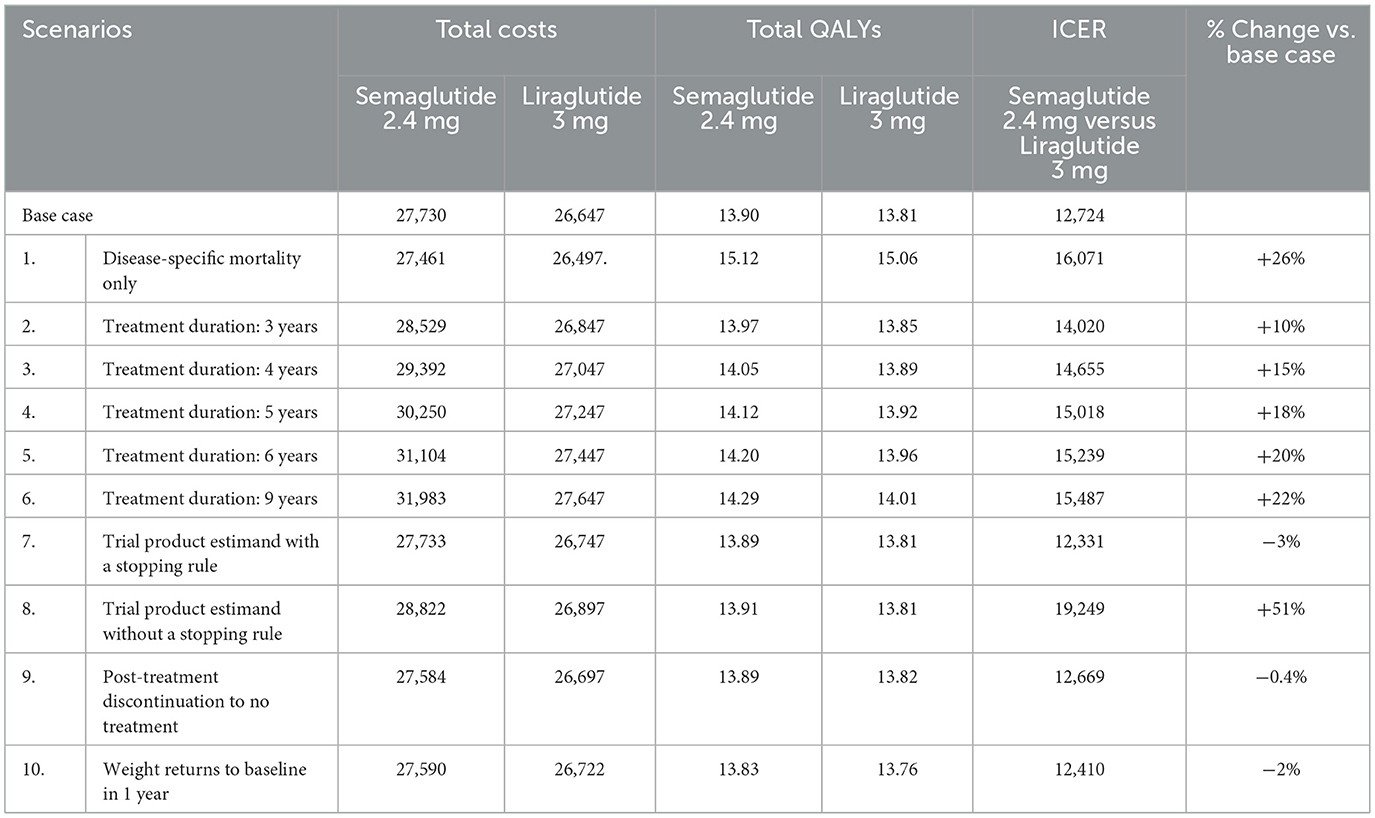 A series of scenario analyses was conducted to explore the impact of alternative input parameters and structural assumptions on cost-effectiveness outcomes. These included: restricting to disease-specific mortality only, extending treatment duration beyond the base case to 3, 4, 5, 6, and 9 years; applying alternative efficacy estimands, namely the trial product estimand (with and without treatment discontinuation for semaglutide 2.4 mg); and modifying post-treatment trajectories, with scenarios assuming reversion to natural progression without the benefit of diet and exercise, as well as accelerated catch-up with treatment effects fading completely within 1 year.
