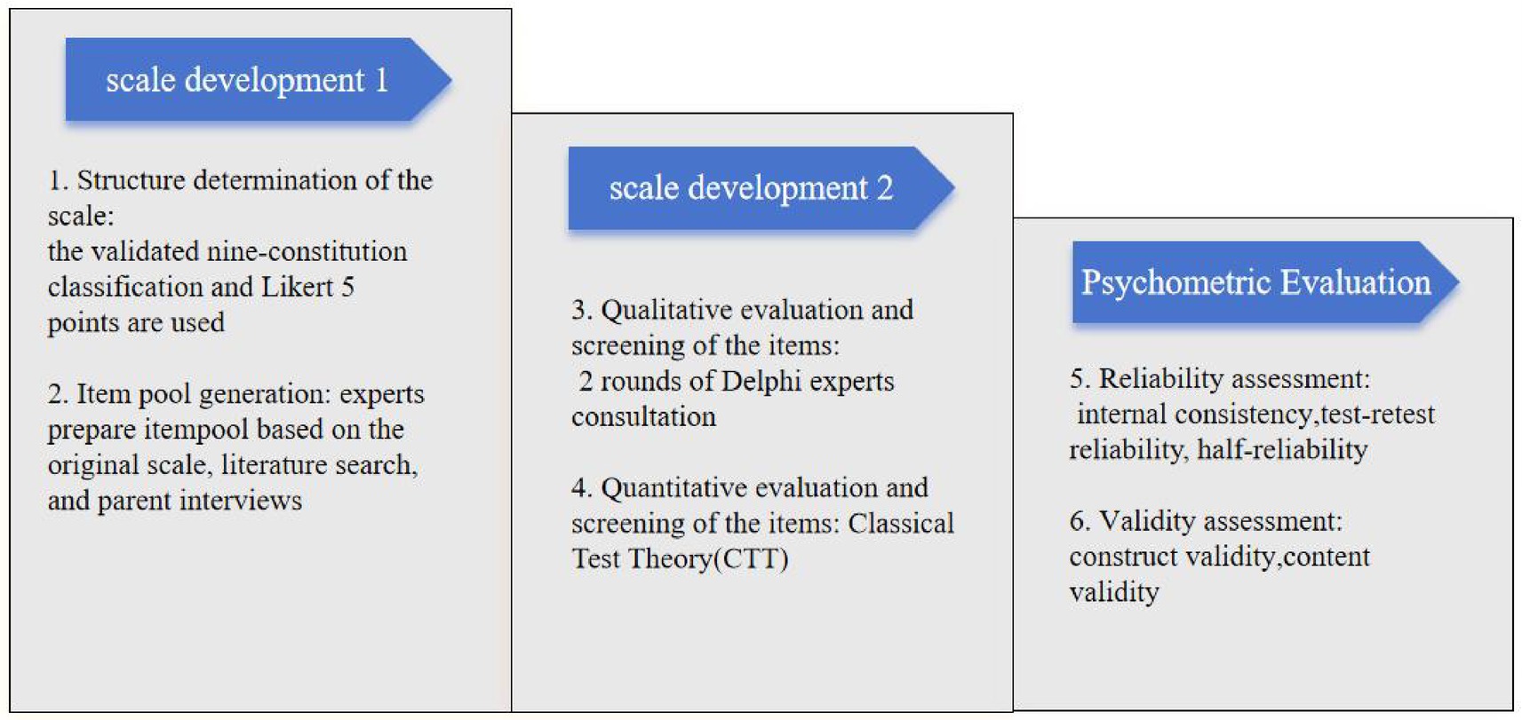This stage aimed to determine the scale’s dimensions and establish an item pool. The scale’s dimensions use nine constitution classification methods, a measurement system with validated psychometric properties (15). The initial draft of the scale was carefully developed by an expert group, drawing on previous research, insights from comprehensive literature reviews and parent interviews, and clinical experience. This also marks the first step in our modified Delphi method. The following is an introduction to each step of our article.