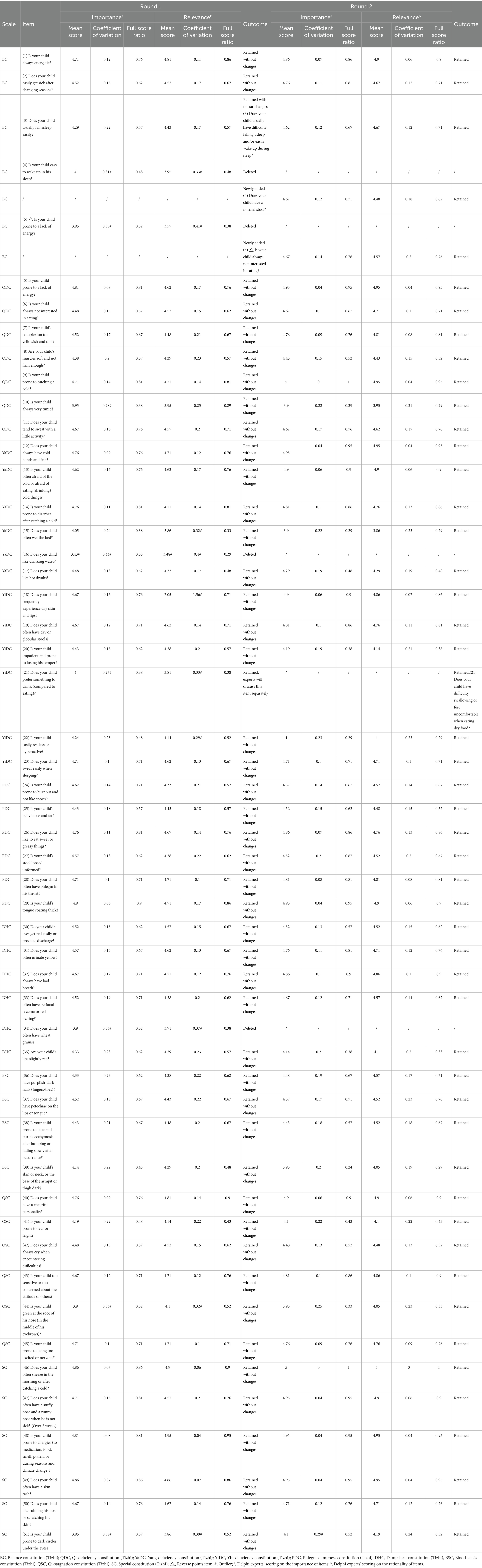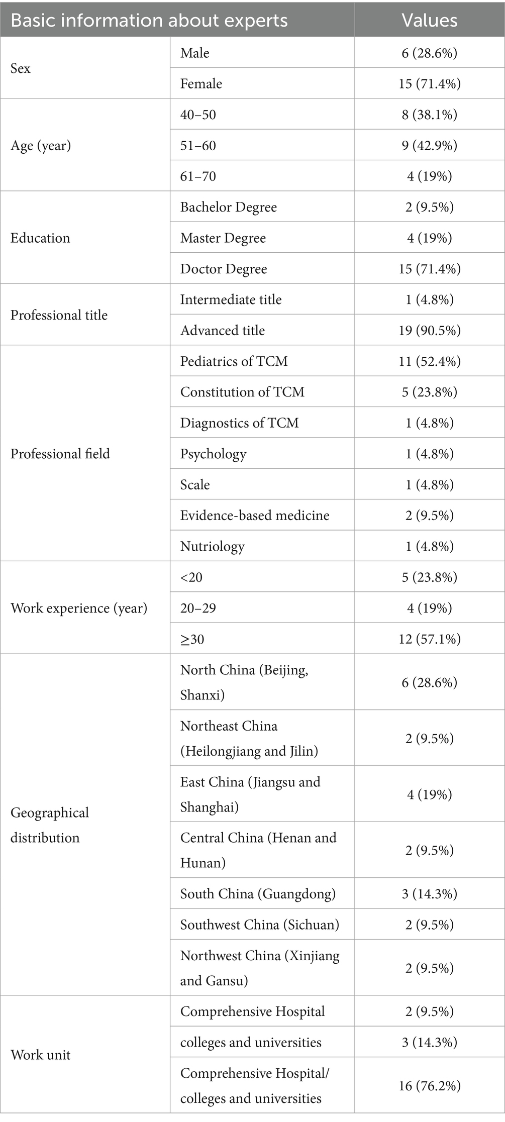 A total of 21 experts were invited from a pre-established expert database and met the following inclusion criteria: 1. holding a bachelor’s degree or higher, with ≥10 years of research experience in their discipline and mid-level or higher professional titles; 2. demonstrated expertise or research background in TCM constitutional theory; 3. the experts’ primary workplace locations were equitably distributed across different administrative regions; 4. high engagement, willingness, and availability to complete two rounds of Delphi consultations; and 5. enough pediatric specialists who can cover comprehensive clinical domains.
