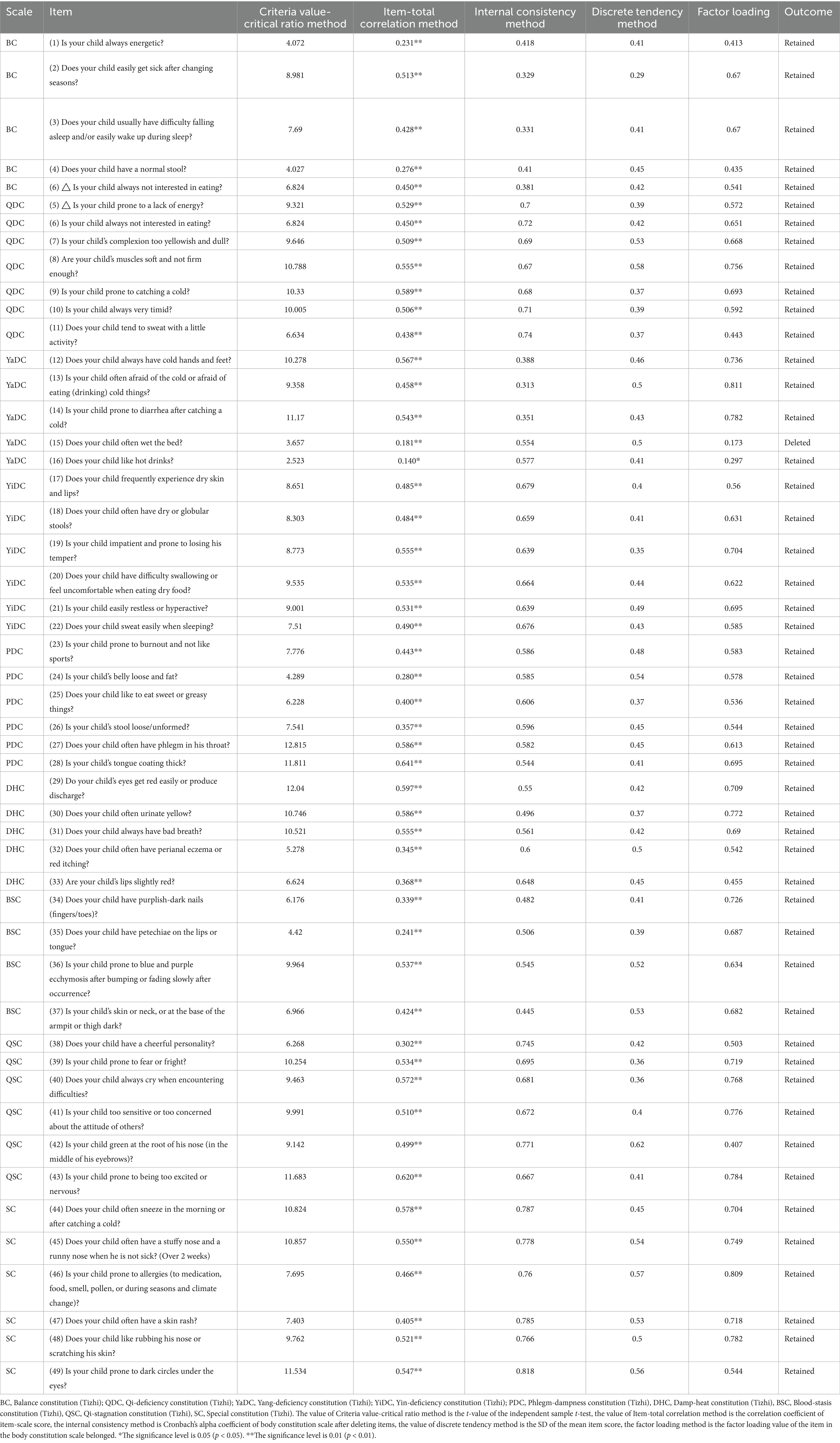 Items meeting ≥4 analytical criteria were retained, while others were appropriately revised based on scale construction requirements: High-Low Grouping Method: All items showed statistical significance (p < 0.05). Item 16 had t = 2.523 (p = 0.013), while other items exhibited t > 3.0. Item-Total Correlation: Items 1, 4, 15, 16, 24, and 35 had corrected item-total correlations < 0.3, though all correlations were statistically significant (p < 0.05). Cronbach’s α Coefficient: Items 15 and 16 reduced the α coefficient of the Yang-deficiency constitution subscale. Deletion of items 33 (Damp-heat), 38/42 (Qi-stagnation), and 49 (Special diathesis) caused negligible α fluctuations (Δα < 0.02). Dispersion Trend: CV > 0.25 for all items, indicating items have adequate sensitivity. Factor Loadings: Item 15 loading = 0.173; Item 16 loading = 0.297 (both < 0.40 threshold). After panel review, Item 4 (“Does your child have a normal stool?”) and Item 15 (“Does your child often wet the bed?”) were removed, retaining 47 items (Table 3).