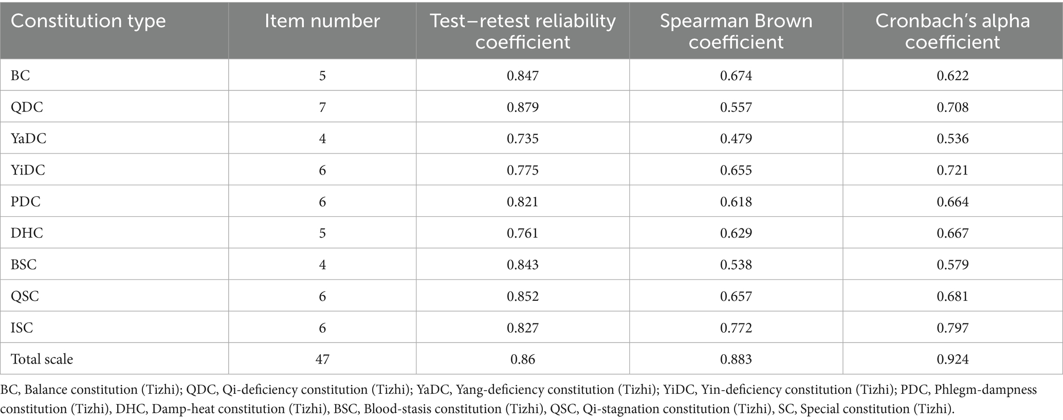 Structural validity analysis indicated that the cumulative variance contribution rate of the extracted common factors reached 60% (Table 5), suggesting that the overall structural validity of the scale is acceptable. However, the validity indices of individual subscales did not reach ideal levels, primarily due to the unique diagnostic features of Traditional Chinese Medicine (TCM) syndromes—namely, the multidimensional and interrelated nature of symptom clusters. This is a very common situation in medicine, and numerous researchers have demonstrated the rational differentiation between syndromes from perspectives such as intestinal flora distribution (22). Specific item combinations could effectively distinguish between different syndrome patterns (e.g., phlegm-dampness vs. damp-heat constitutions, as shown in Table 6). Symptom overlap among syndromes led to cross-loading issues within the subscale factor structures. For example, due to the presence of “dampness” factors, both phlegm-dampness and dampness-heat types easily manifest as sticky stools. This issue has also been reported in a previous study (13, 15). Although earlier analyses, including discrete trend analysis, homogeneity testing, and item-total correlation (coefficients > 0.4), demonstrated acceptable item discriminative validity, the polysemous nature of core symptoms—often key to clinical differentiation—inevitably contributes to increased structural complexity.