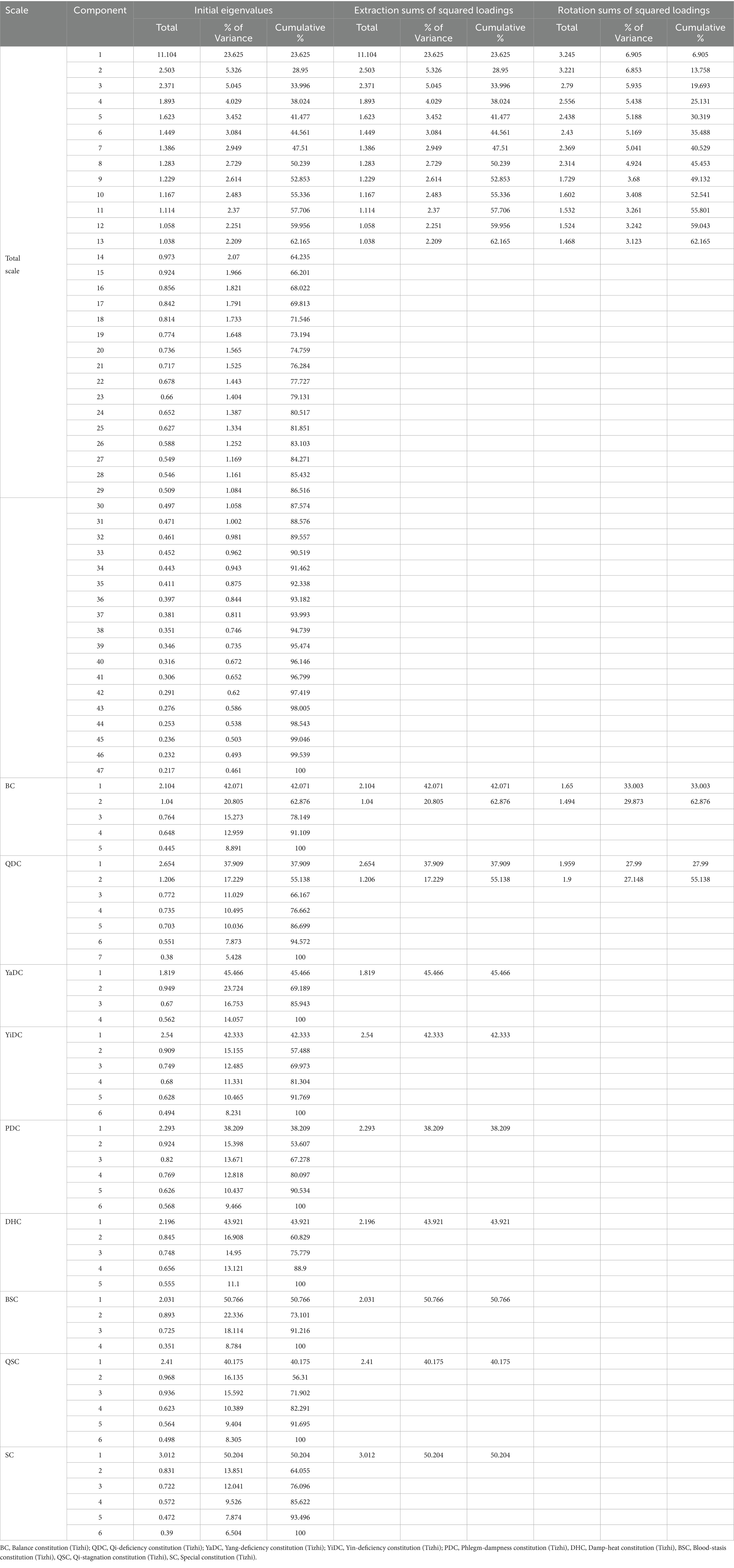 The KMO measure for the scale was 0.886, and Bartlett’s test of sphericity yielded χ2 = 5308.679 (p < 0.001), confirming the suitability for factor analysis. Under natural extraction conditions, 13 common factors were identified, accounting for 62.156% of the cumulative variance. When specifying nine factors (aligned with the subscale design), the cumulative variance explained was 52.853%, indicating adequate explanatory power for constitution-type classification. Detailed results for the full scale and subscales are provided in Table 5, while rotated factor loadings and distribution patterns are presented in Table 6.