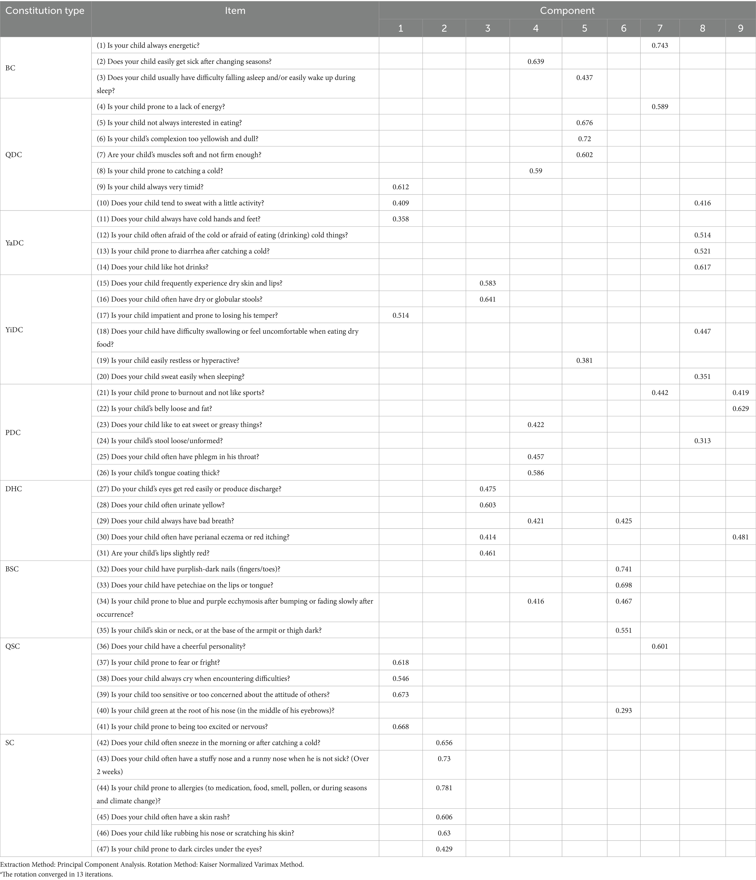 Although this study has not yet fully verified the model’s robustness through confirmatory factor analysis (CFA) and cross-validation, the exploratory factor analysis (EFA) results demonstrated strong theoretical and clinical alignment with the core concepts of traditional Chinese medicine (TCM) syndromes. This indicates that the extracted nine-factor model possesses good theoretical interpretability and practical potential at this stage. Due to the limitations of sample size and the exploratory nature of this research phase, further investigation into the factor structure could not be conducted. Future studies will employ larger and independent samples to perform CFA and cross-validation, thereby enhancing the verification of the stability and generalizability of the proposed nine-factor model. Such efforts will contribute to the refinement of the pediatric constitution scale and the advancement of theoretical understanding in this field.